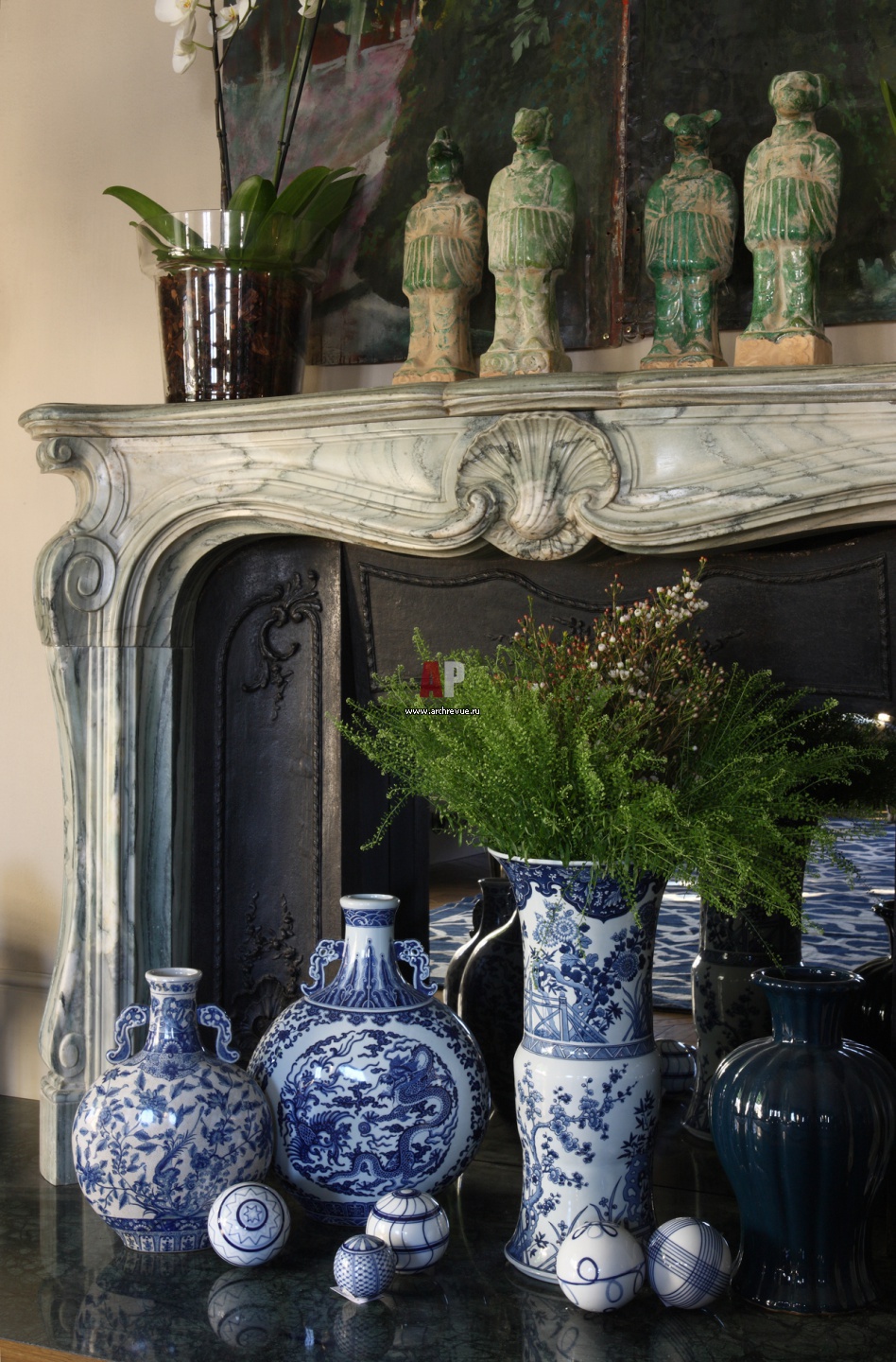 Камин антикварный. Китайские вазы и голландский фаянс.