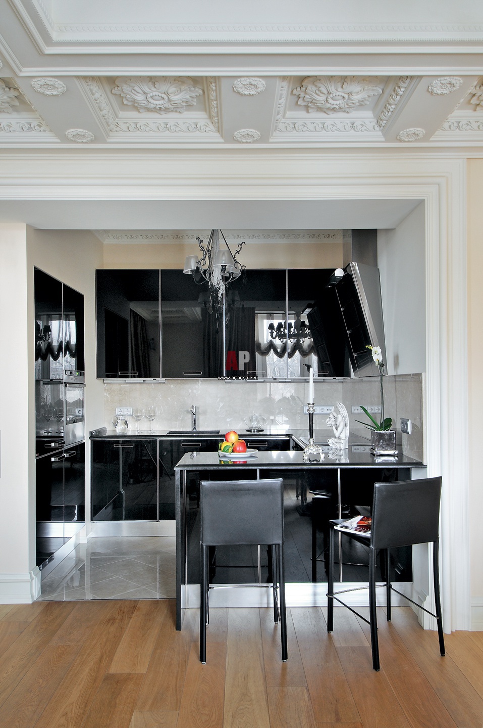 Современный кухонный гарнитур Scavolini, поставщик Scavolini, вписан в классическую раму из гипсового орнамента, лепнина - поставщик «Петергоф». Люстра Baga, поставщик A&D Interiors.