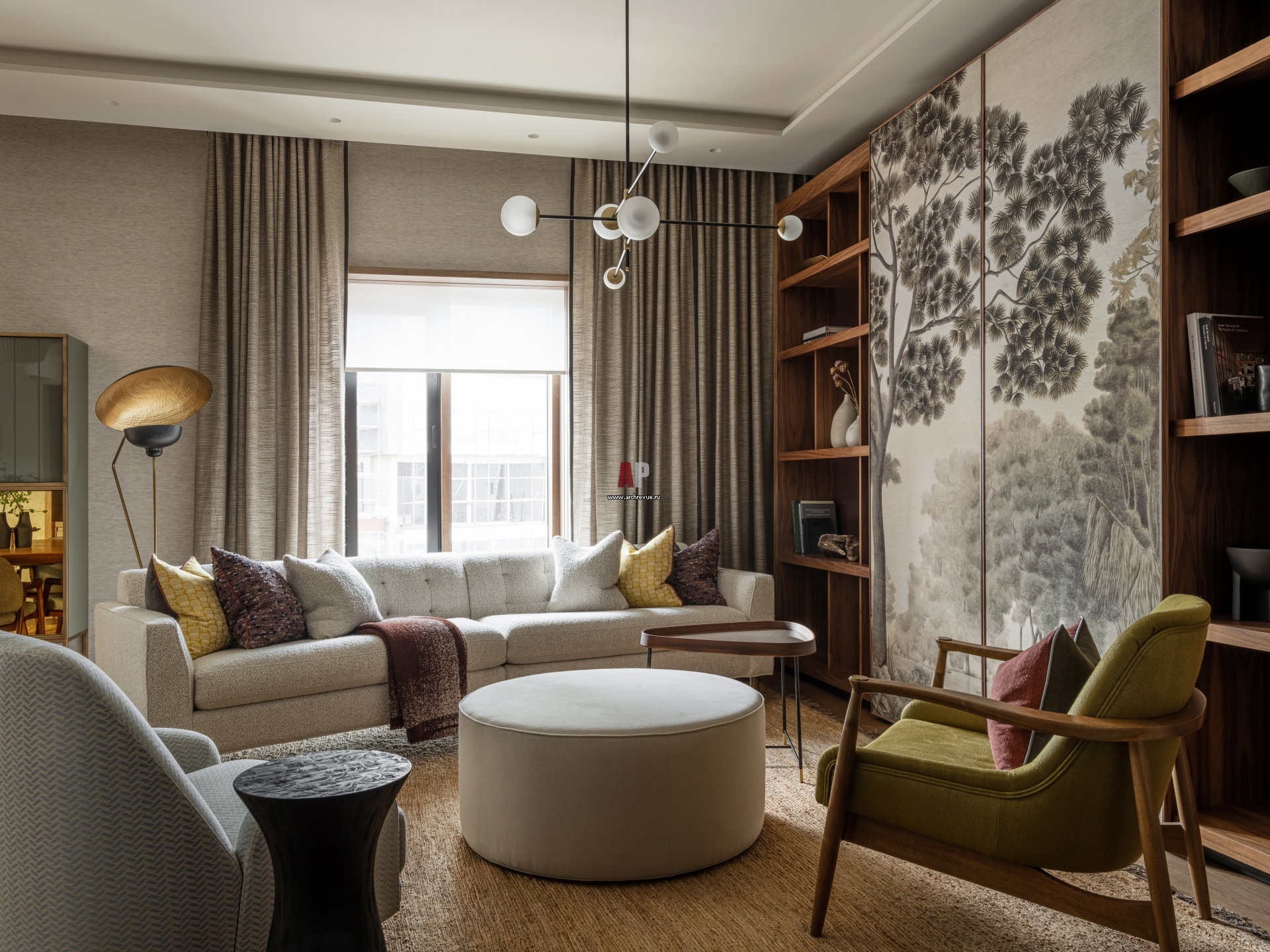 Спокойная квартира с многослойным интерьером. Диванная группа в общей гостиной. На стенах – льняные обои, Phillip Jeffries. На полу – ковер из конопли, Massimo Copenhagen.