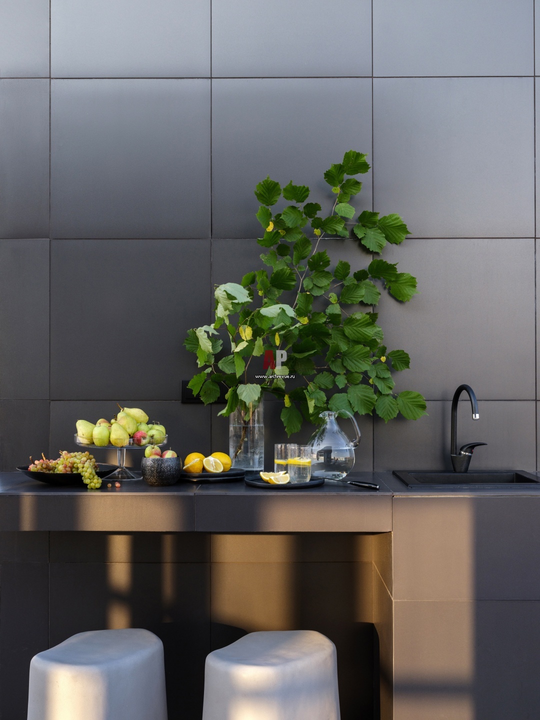 Кровлю дома дизайнер переделала. Это позволило вывести на крышу дополнительные коммуникации и организовать мини-кухню и душевую.