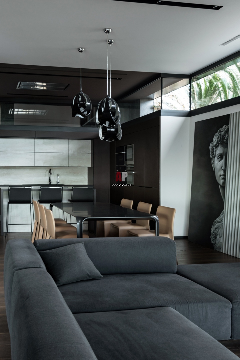 Современная 3-х этажная вилла с бассейном на побережье Испании. Интерьер кухни-столовой оформлен в стиле минимализм. В кухонные пеналы встроены винный и духовой шкафы, СВЧ-печь. Кухонная техника, Fulgor Milano.