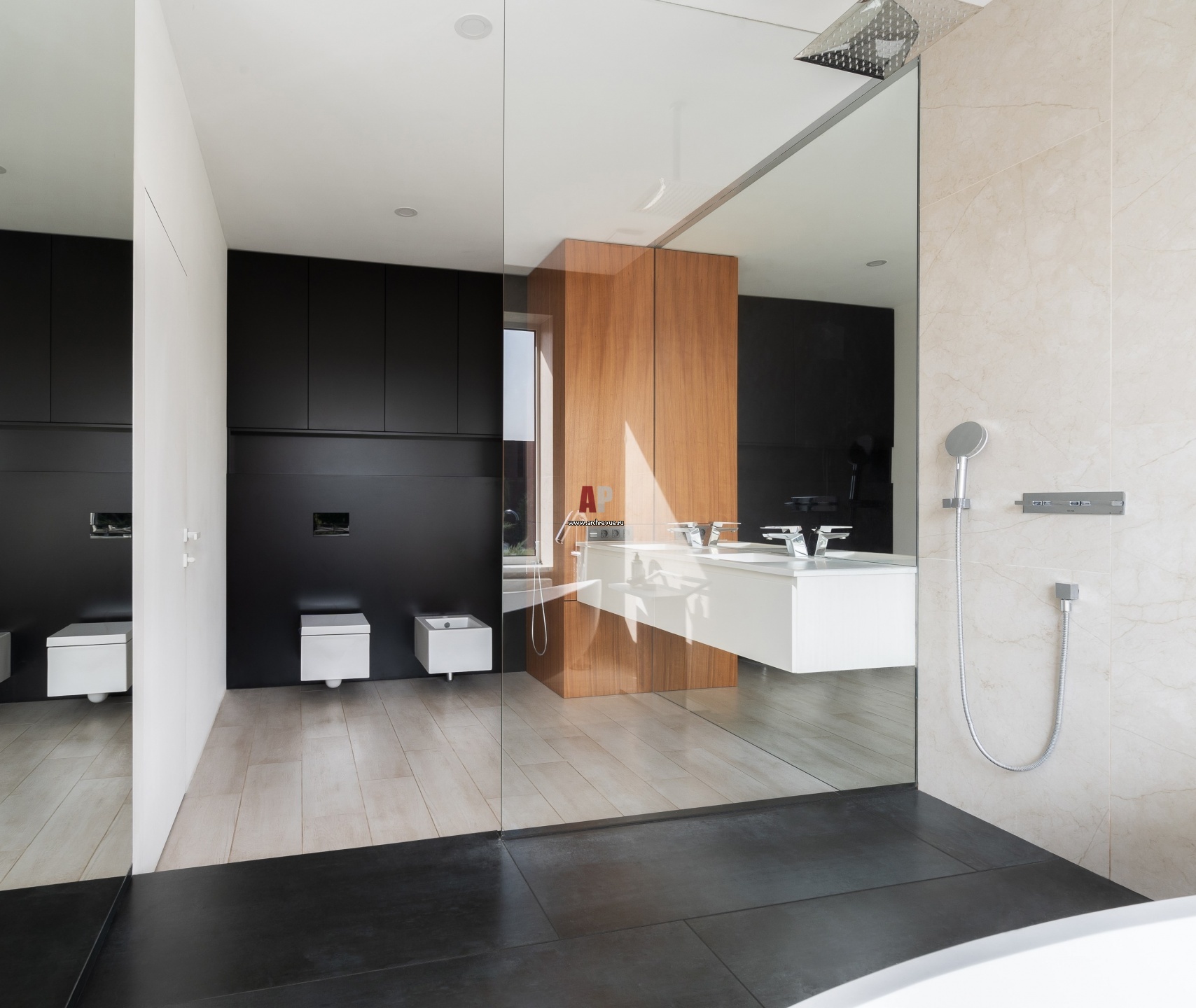Хозяйская ванная комната. На полу — керамогранит, ItalON и FAP Ceramiche. На стенах — керамогранит, ItalON. Унитаз и биде, Simas, коллекция Frozen. Душевой трап, Viega.