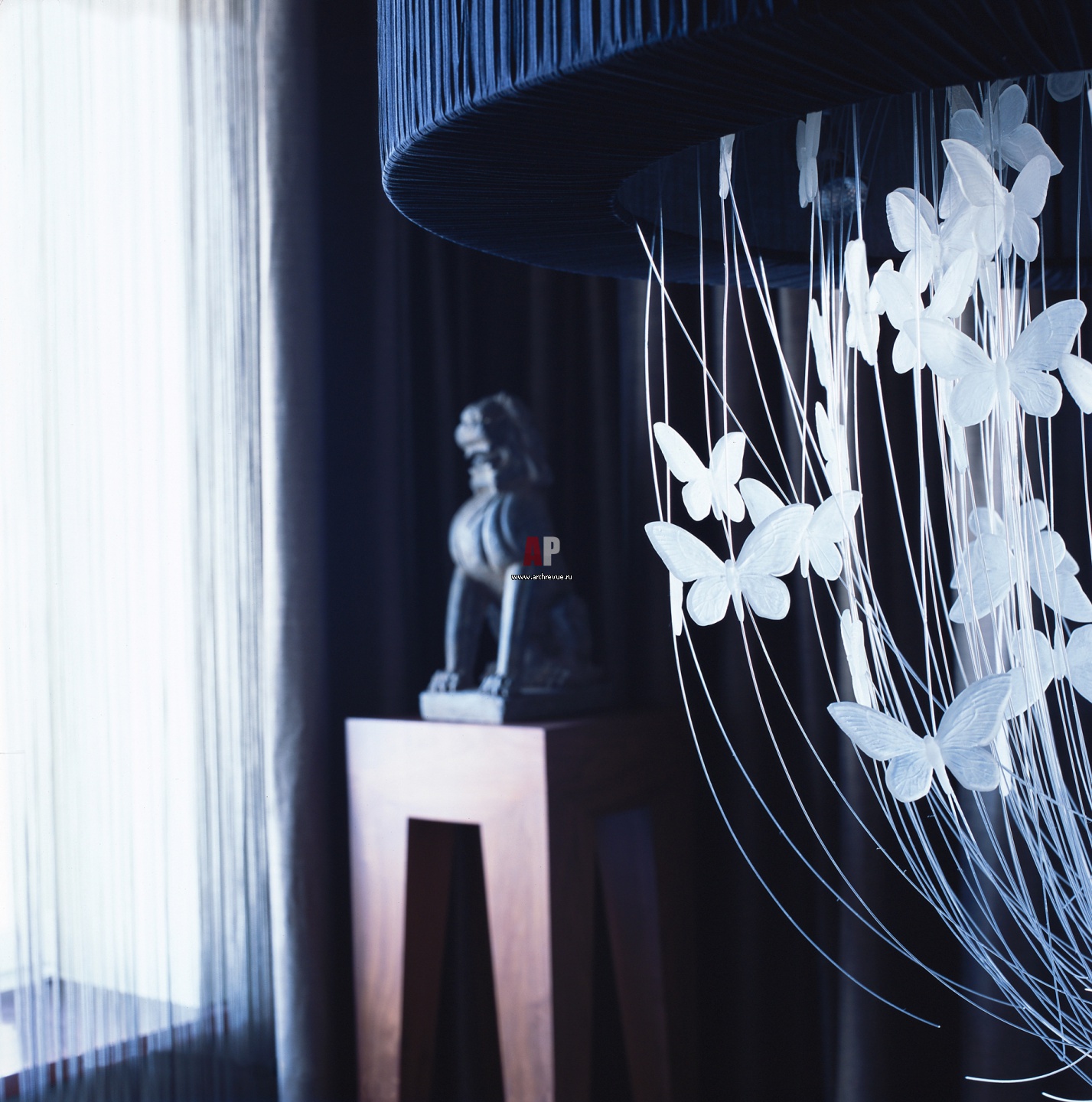 Фрагмент интерьера японской квартиры. Светильник украшен светодиодными нитями с бабочками.