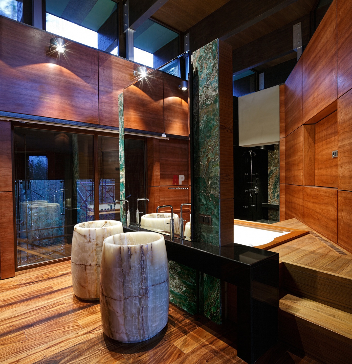 Хозяйская ванная зашита деревянными панелями из тикового дерева. На полу – массивная доска из табакко. Перегородка декорирована ониксом изумрудно цвета.