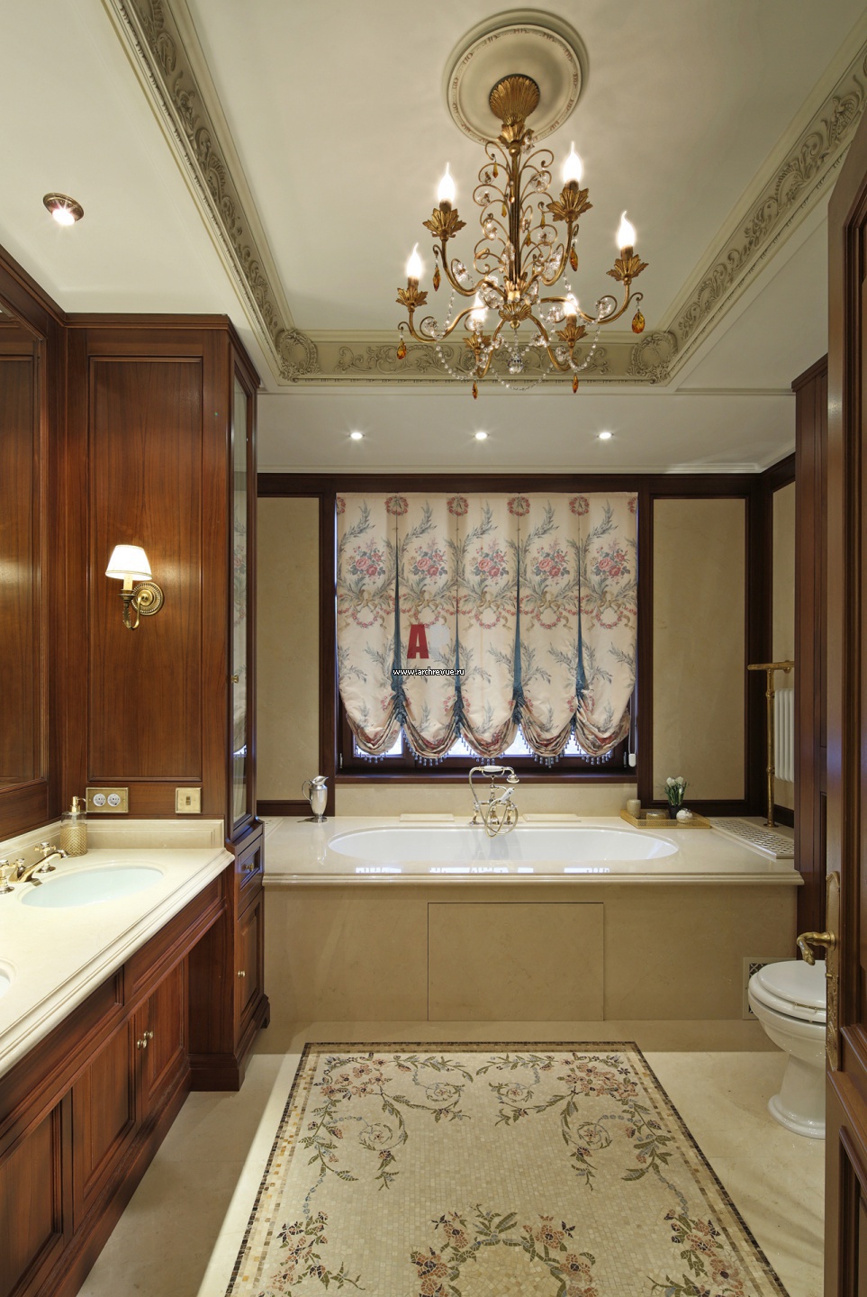 Интерьер классической ванной комнаты с окном. Созданный по авторским эскизам узор мозаики на мраморном полу поддержан цветочным рисунком штор и изящным лепным карнизом.