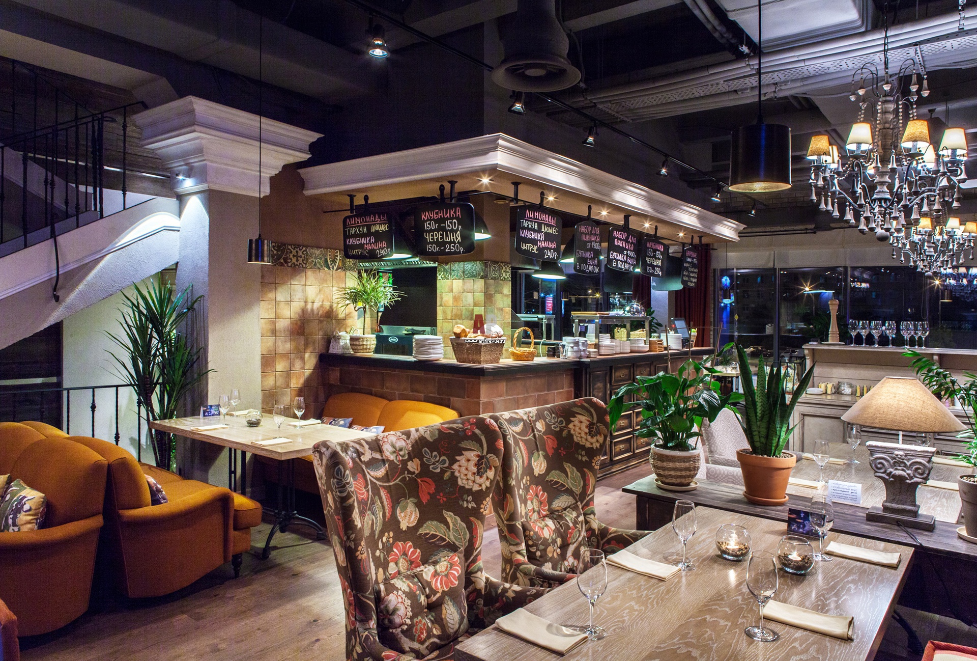 Дизайн интерьера ресторана с элементами стиля лофт. Практически вся мебель выполнена на заказ. В обивке стульев и кресел использован текстиль с дизайном sweet & honey.