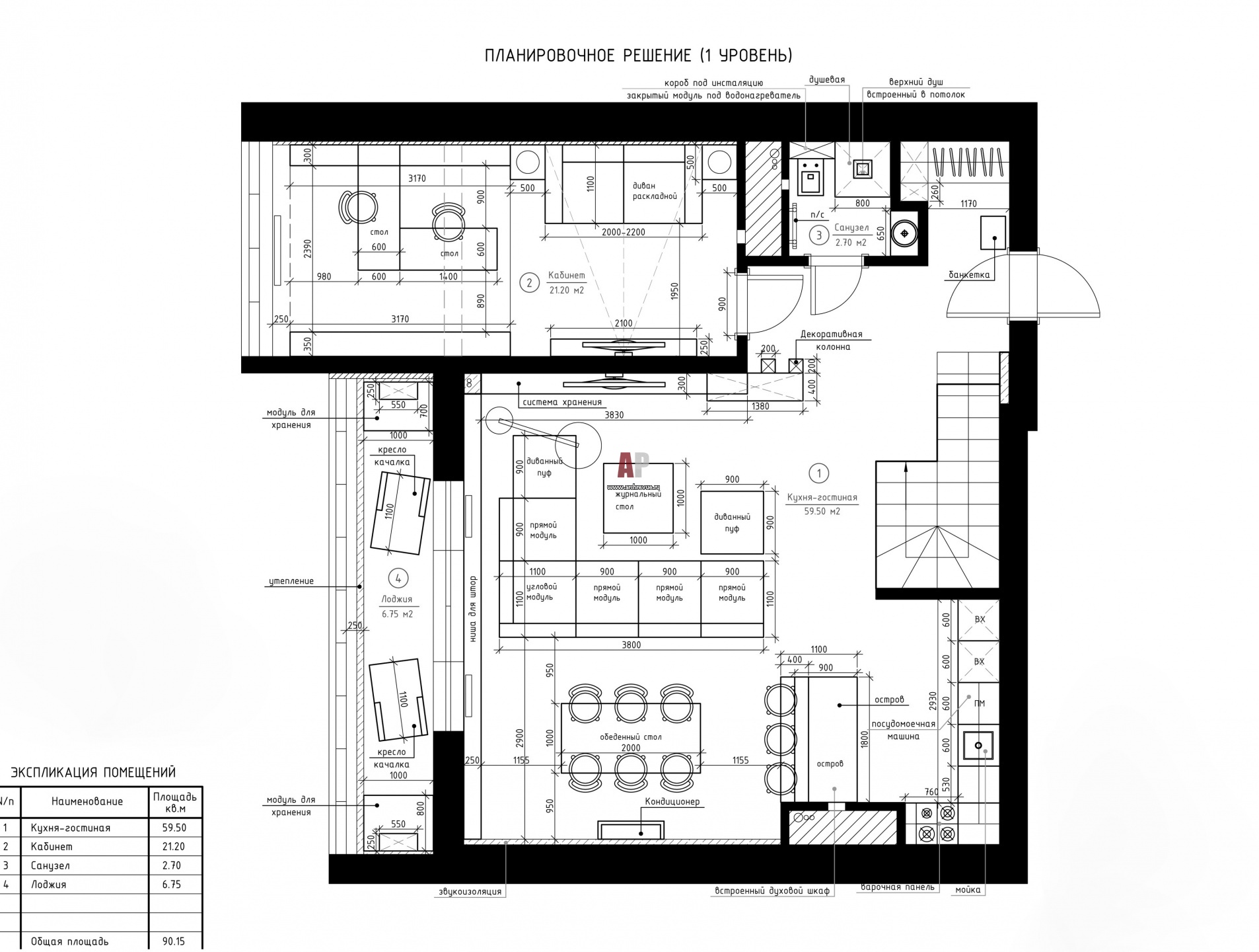 Планировка 1 этажа 2-х этажного пентхауса для семьи с детьми в Москве.