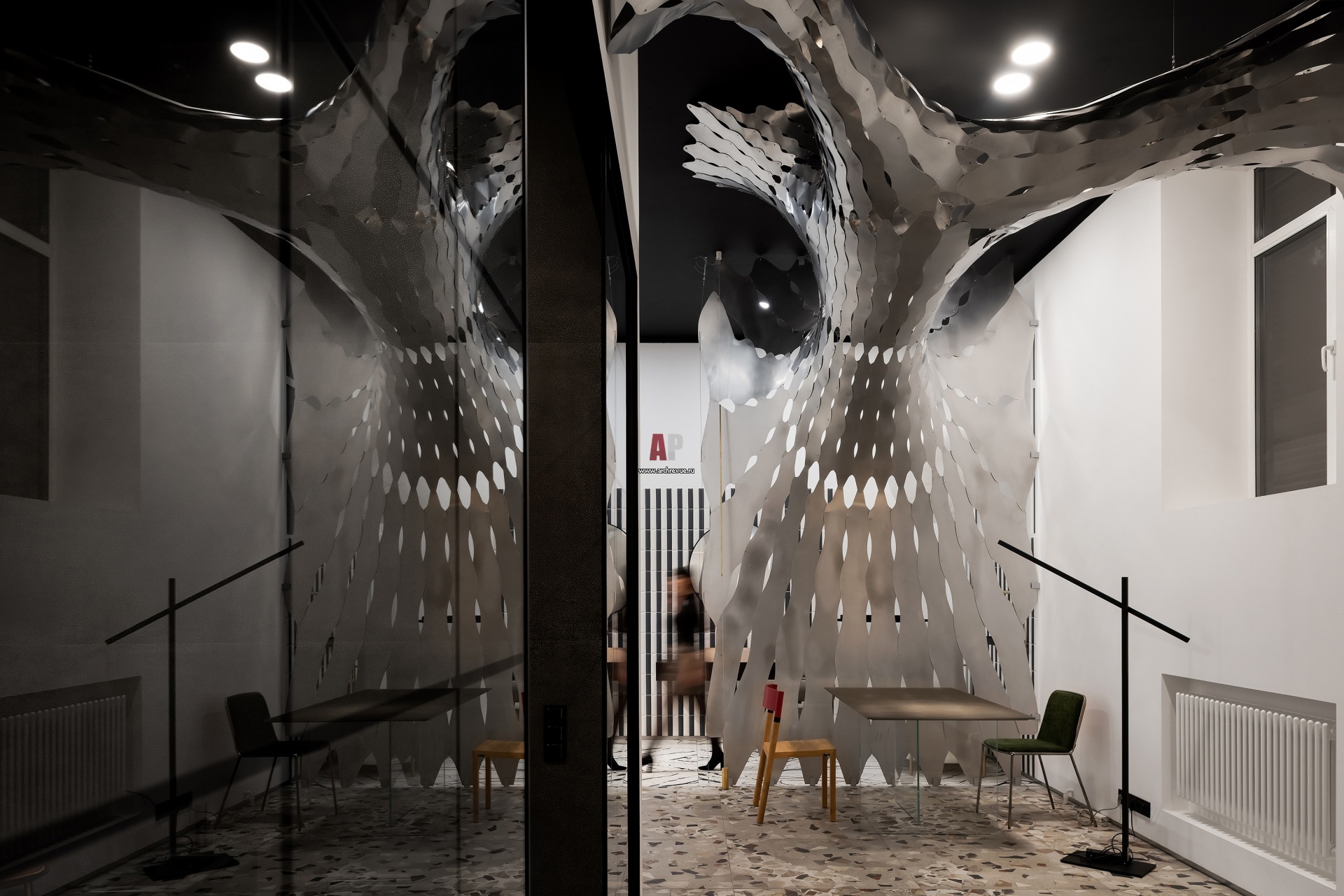 Центральный элемент пространства – металлическая композиция из 485 алюминиевых элементов. При ее моделировании и производстве был использован метод алгоритмического проектирования.