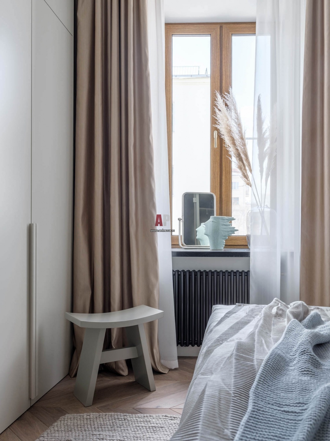 В камерной спальне большой шкаф окрашен в цвет стен, он не загромождает и без того небольшое помещение. Табурет, BoConcept, модель Shogun. На полу – дубовый пакет-елочка.