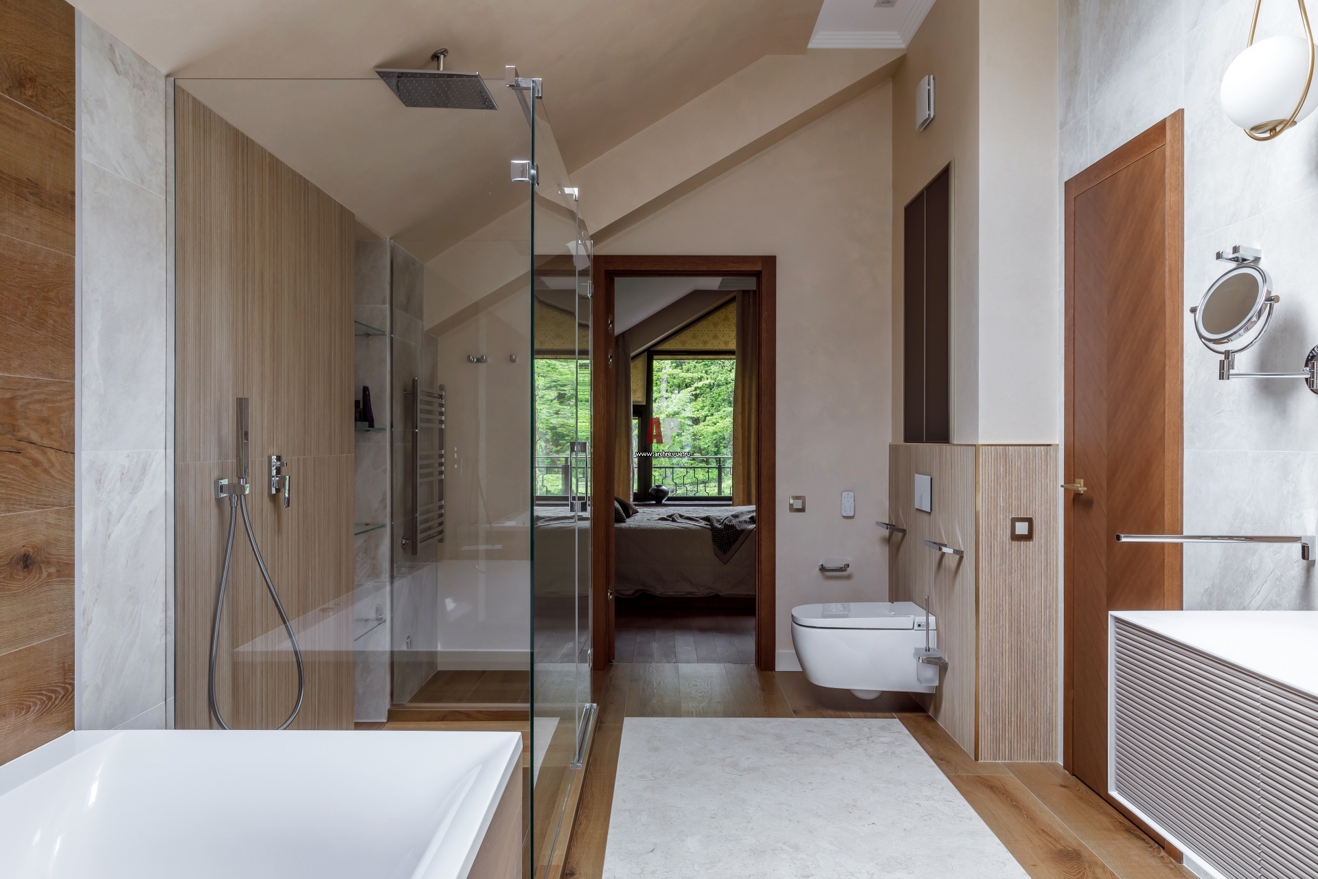 Современный двухэтажный дом с элементами стиля шале. Ванная комната при мастер-спальне. На стенах – декоративная штукатурка и керамогранит. В зоне ванны и на полу – керамогранит под дерево.
