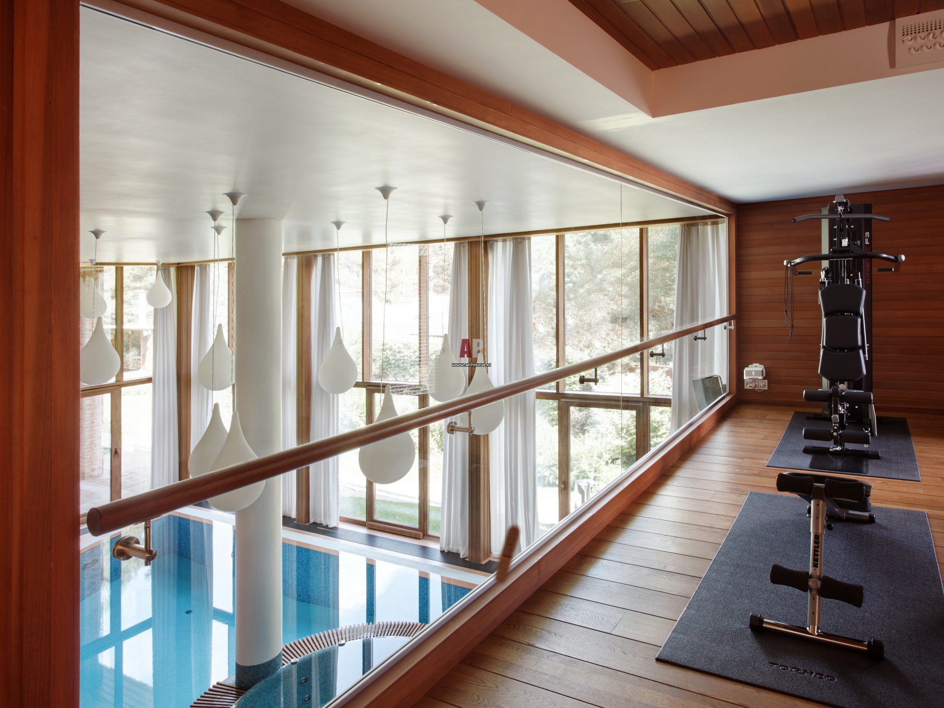 Спортзал с тренажерами находится на надстроенном балконе в бассейне. Стеклянная перегородка от пола до потолка создает ощущение единого объема. Стены помещения зашиты вагонкой из канадского кедра.