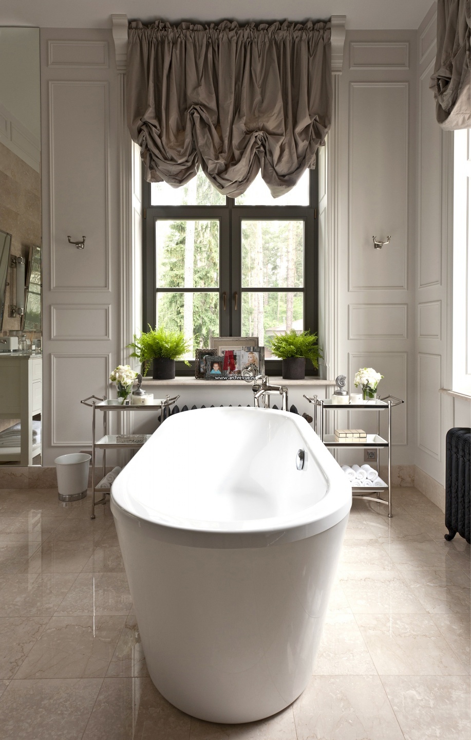 Стены в ванной украшены декоративной штукатуркой и гипсовой лепниной. Отдельно стоящая ванна Pottery Barn размещена возле окна.