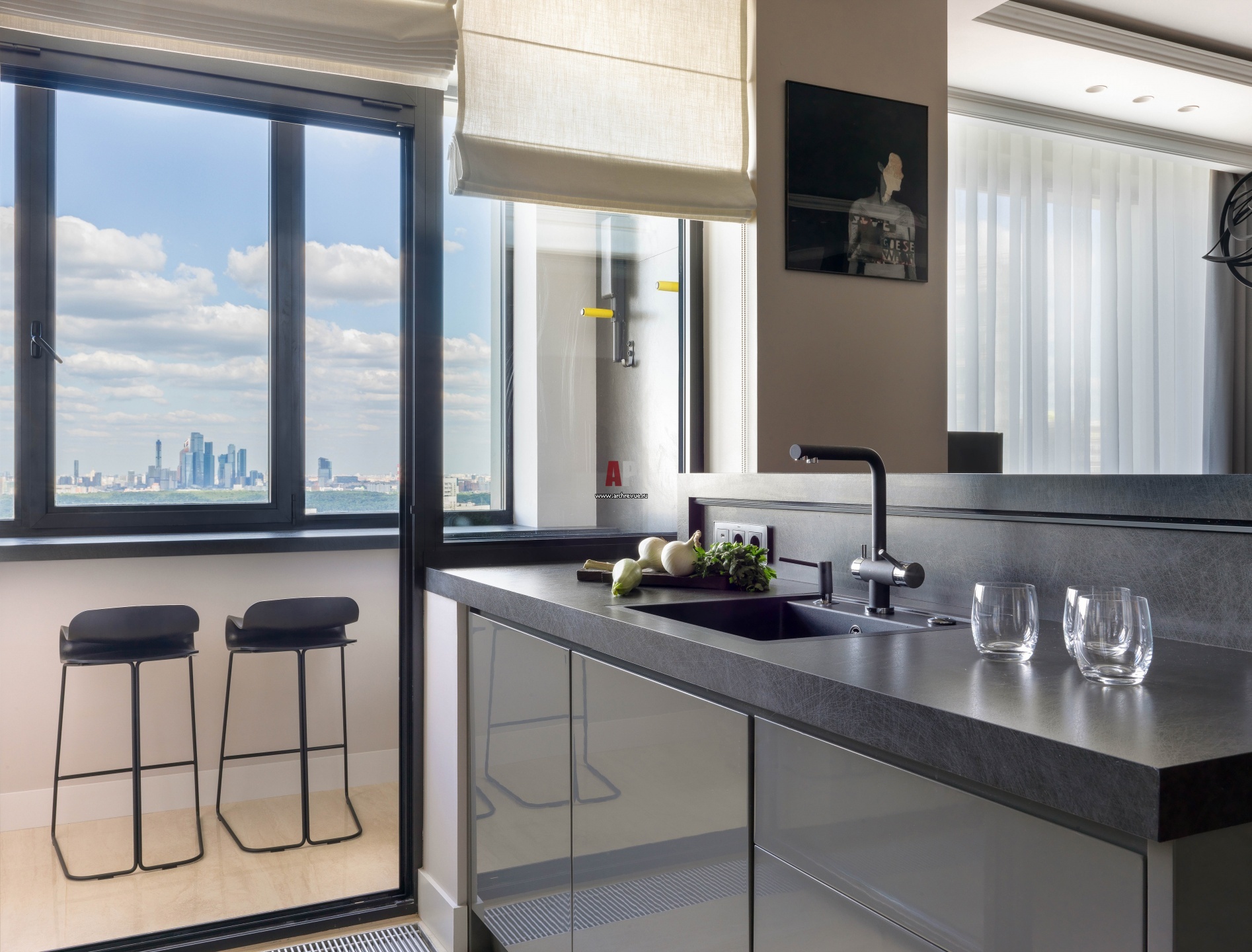 На присоединенном балконе расположена зона для завтраков (столешницей служит подоконник), а также спортивная зона с тренажерами. Барные стулья, Tonon.