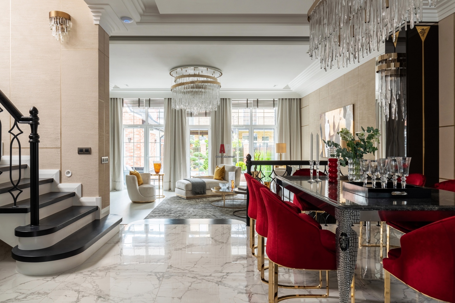 Из-за сложной архитектуры дома первый этаж получился двухуровневым. Он полностью отдан под парадную зону гостиной-столовой-кухни. Стены оформлены декоративной штукатуркой на основе мрамора и кварца Travertino Romano (Oikos) с золотой расшивкой.