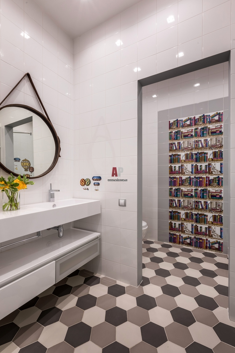 Детский санузел решен на контрасте однотонных стен, трехцветных полов и декоративного керамического панно с изображением библиотеки. Керамическая плитка, Ceramica Bardelli.