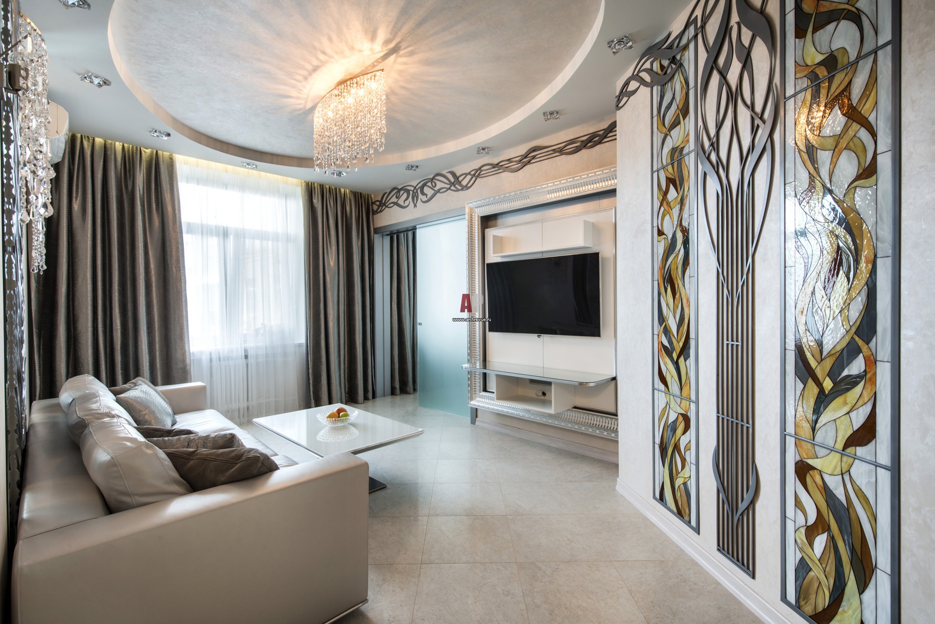 Современная гостиная с элементами неоклассики. Центральный декоративный элемент помещения – художественная композиция из кованого металла с серебряным финишем и цветных витражей в технике Тиффани в стиле ар-нуво. Кованое полотно имеет минимальную толщину, около 2 мм.