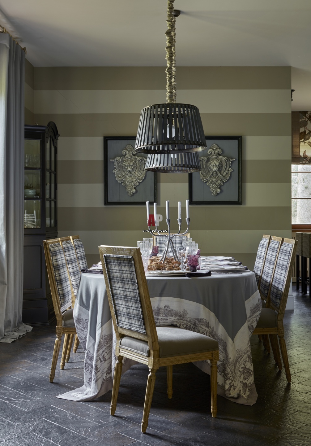 Интерьер столовой в духе традиционных бельгийских интерьеров. Пол покрыт плиткой с фактурой сланца, нарезанной полосками и выложенной в форме паркетной елочки. Люстры, Fancy Home Collection.
