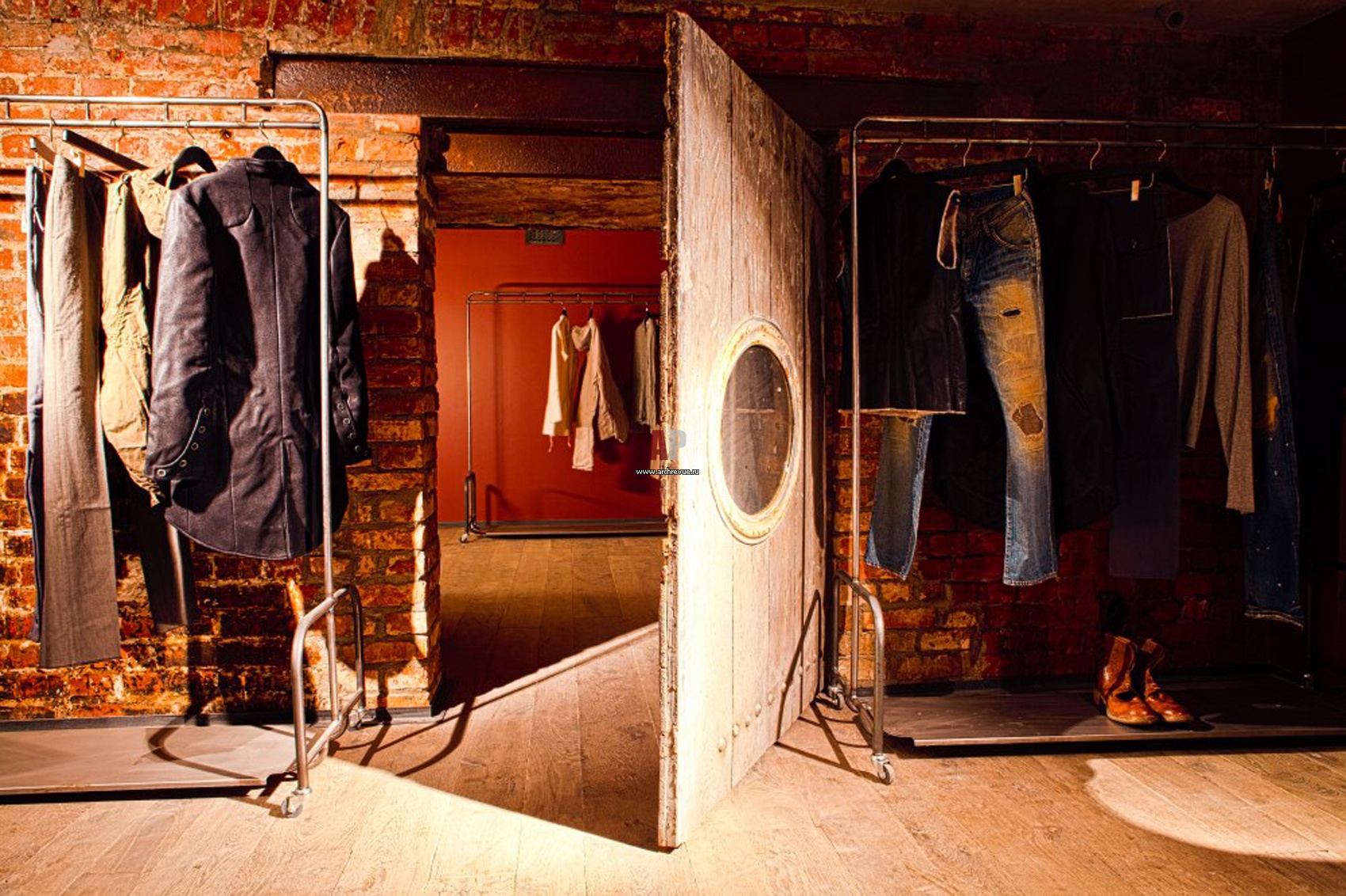 Вид со стороны торгового зала на примерочную. Дверь в примерочную – амбарная доска с окном-иллюминатором.