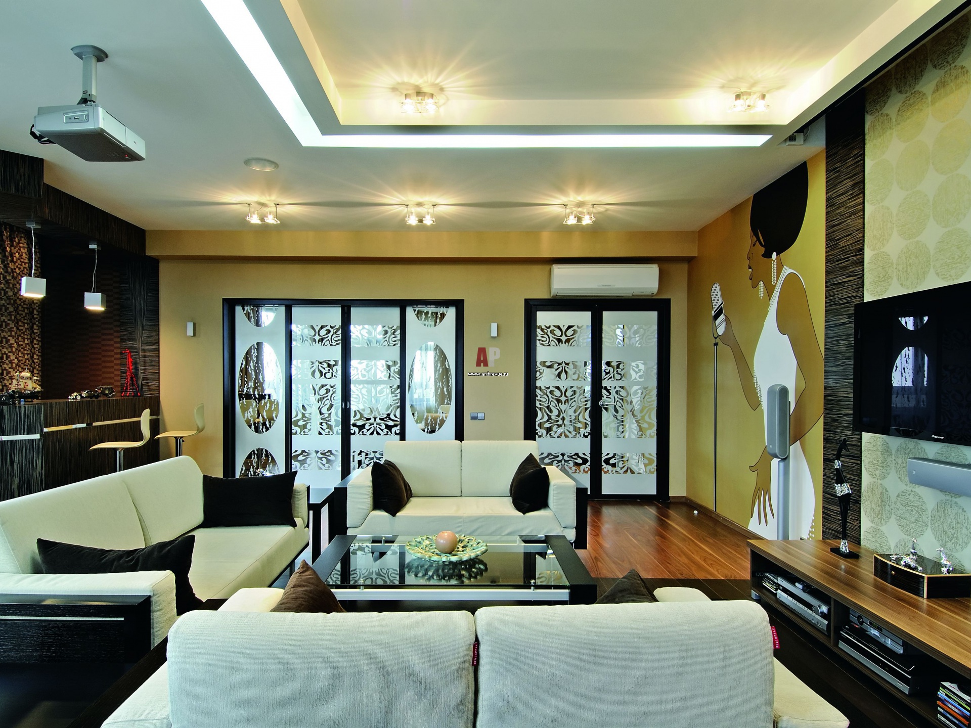 Яркие акценты интерьера гостиной – двери и раздвижные перегородки из стекла с авторским пескоструйным орнаментом, изготовление «Ателье стекла», и порталами из тонированного дуба.