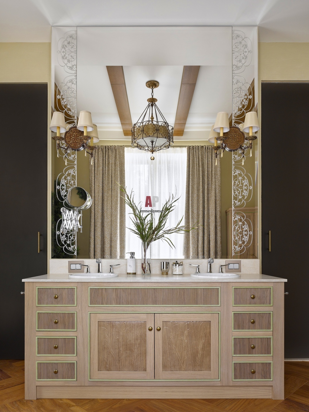 Зона умывальника в хозяйском санузле. Тумба под раковины со вставками из стекла с барельефным изображением листьев и зеркало с изящной гравировкой сделаны на заказ.