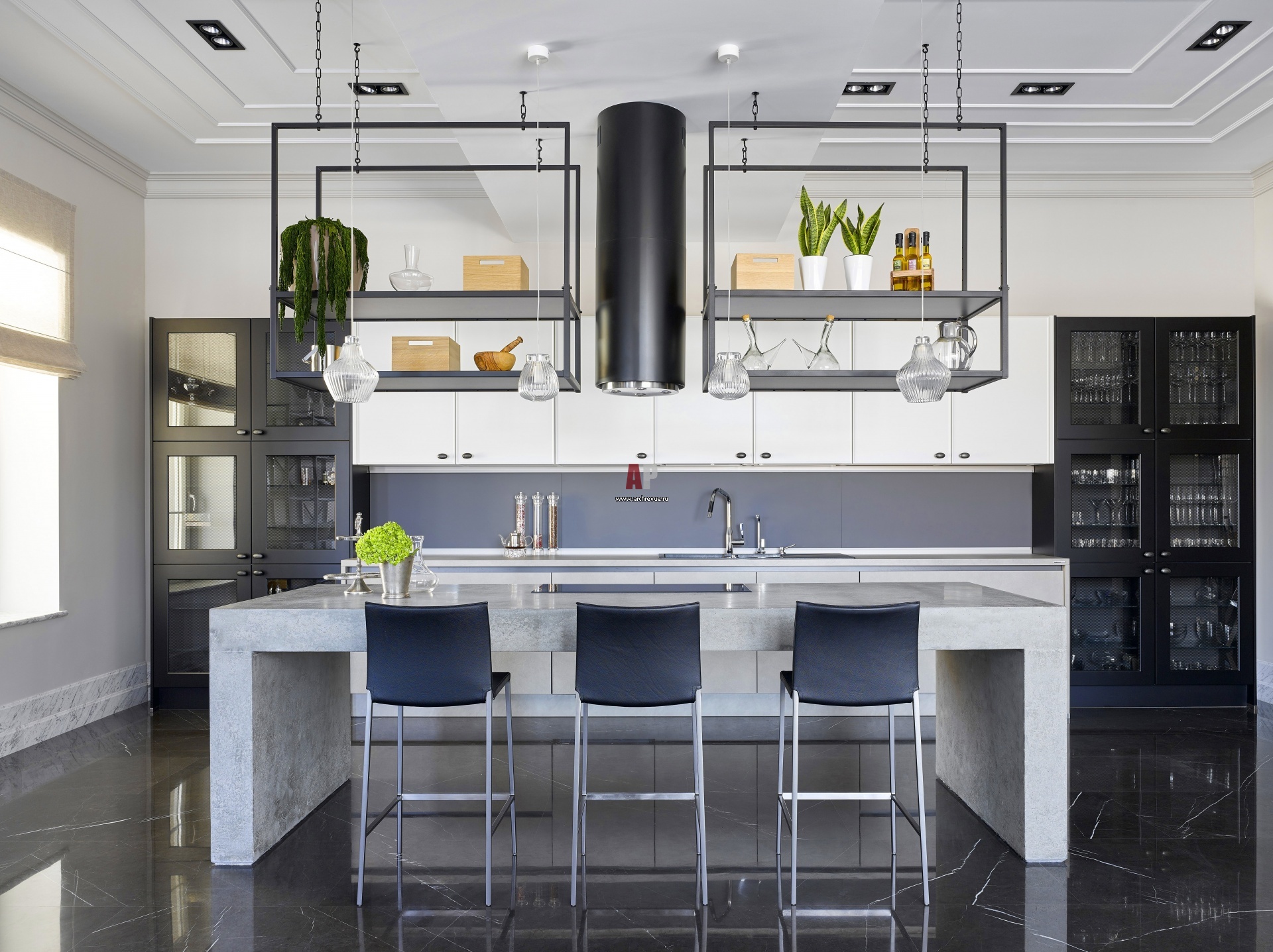 Кухня решена в минималистичном стиле с элементами металла и дополнена монументальным бетонным островом, на котором располагается варочная поверхность. Кухонный гарнитур, Nolte. Светильники над островом, Karman.
