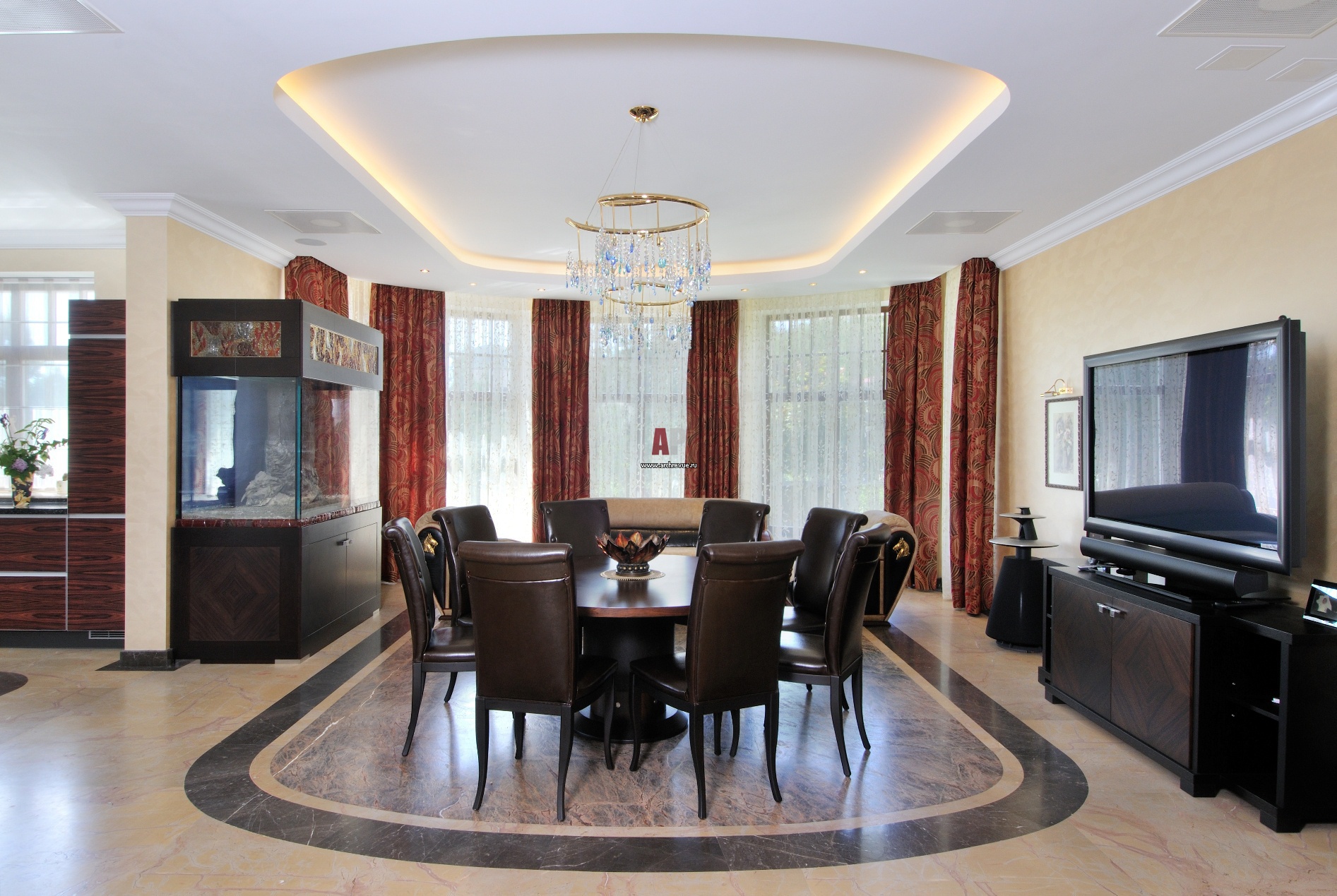 Столовая, включенная в открытое пространство общей зоны, выполнена в сдержанном и торжественном стиле. Рисунок полов подчеркивает многоуровневое членение пространства.