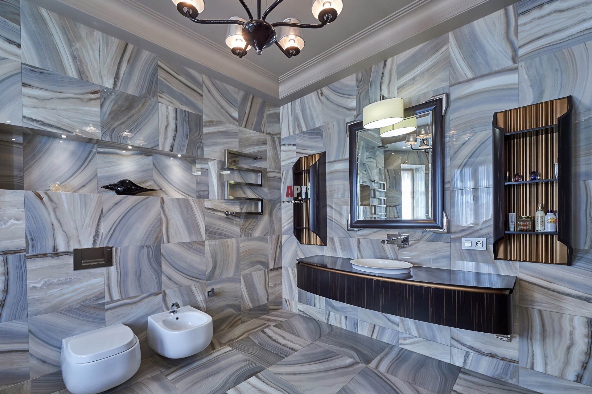 Стены и пол ванной комнаты выложены серым керамогранитом с фактурой природного камня. Плитка размещена в хаотичном порядке, благодаря чему интерьер выглядит экспрессивным.