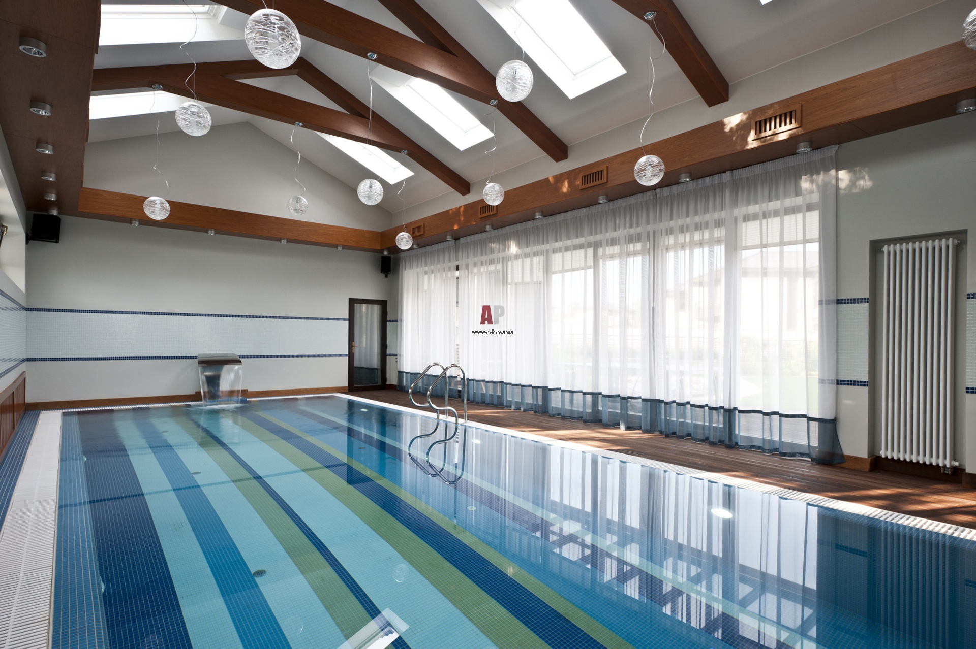 Чаша бассейна выложена мозаикой разных цветов. На потолке – массивные балки из тонированного дерева.