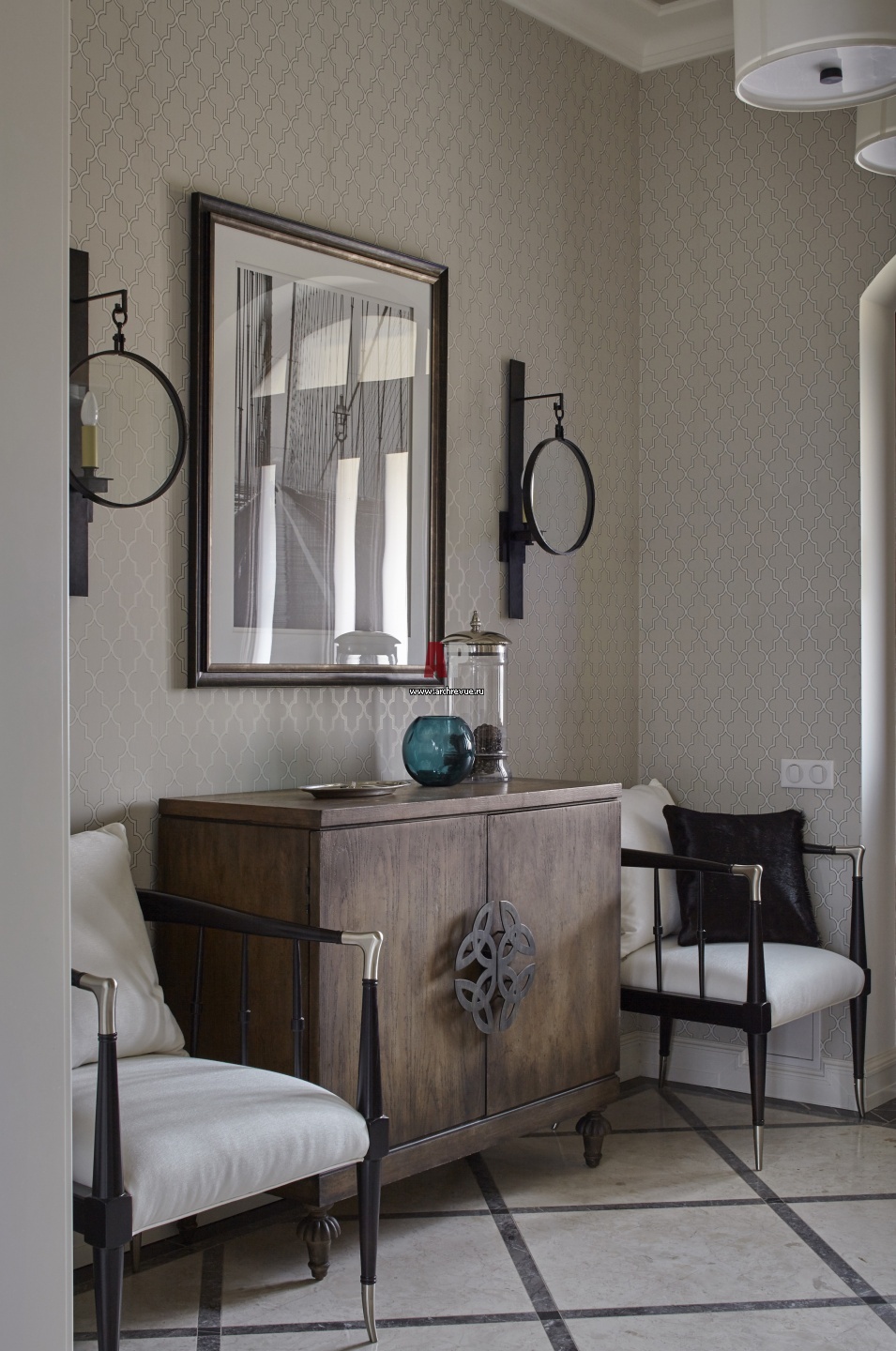 Интерьер прихожей частного загородного дома. Дубовый комод, Hooker. Кресла с латунными ножками, Caracole.