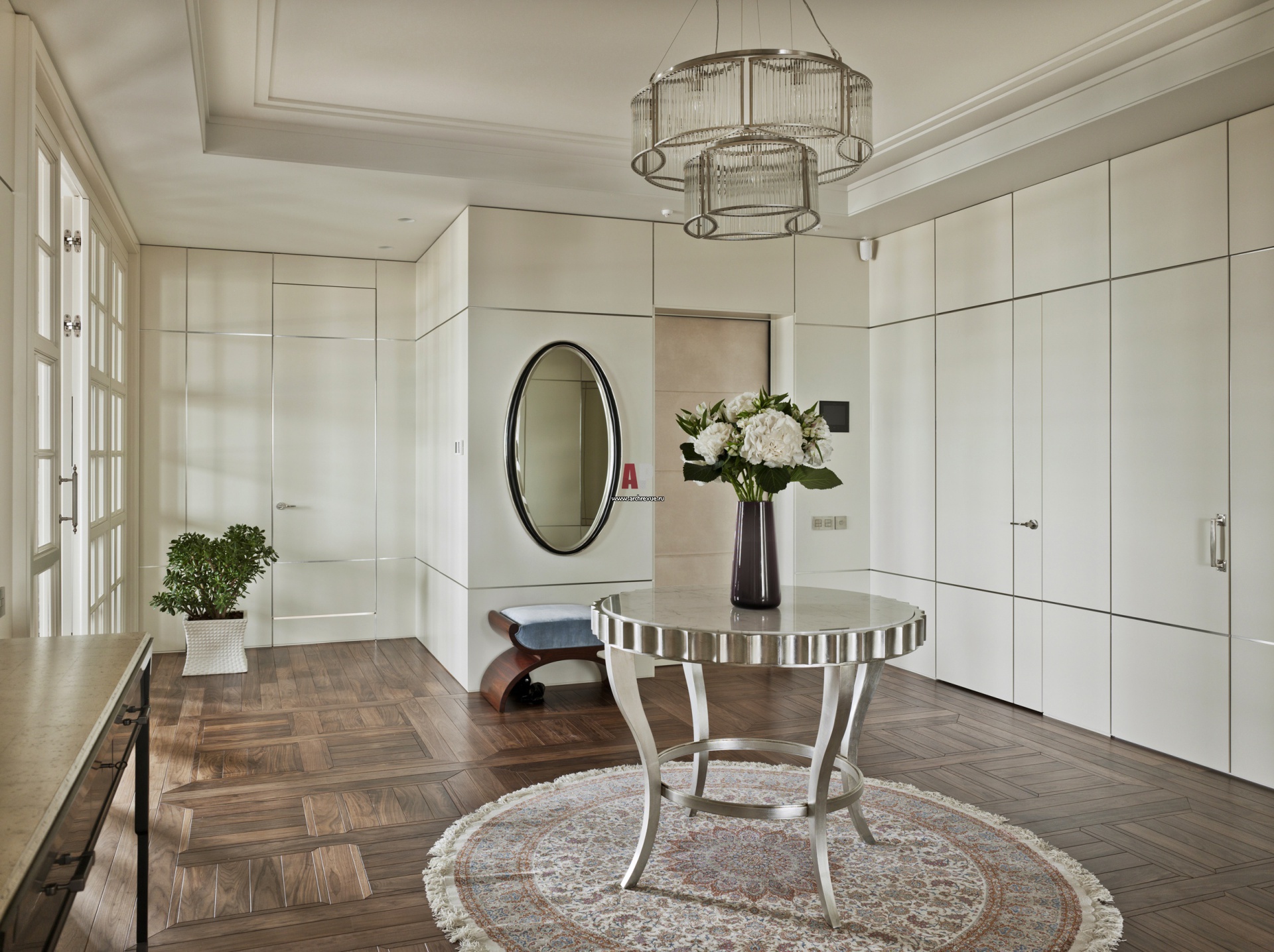 Стеновые панели, двери и встроенные шкафы в прихожей составляют общую композицию. Геометрическая раскладка из светлого дерева подчеркивается тонким металлическими кантом.