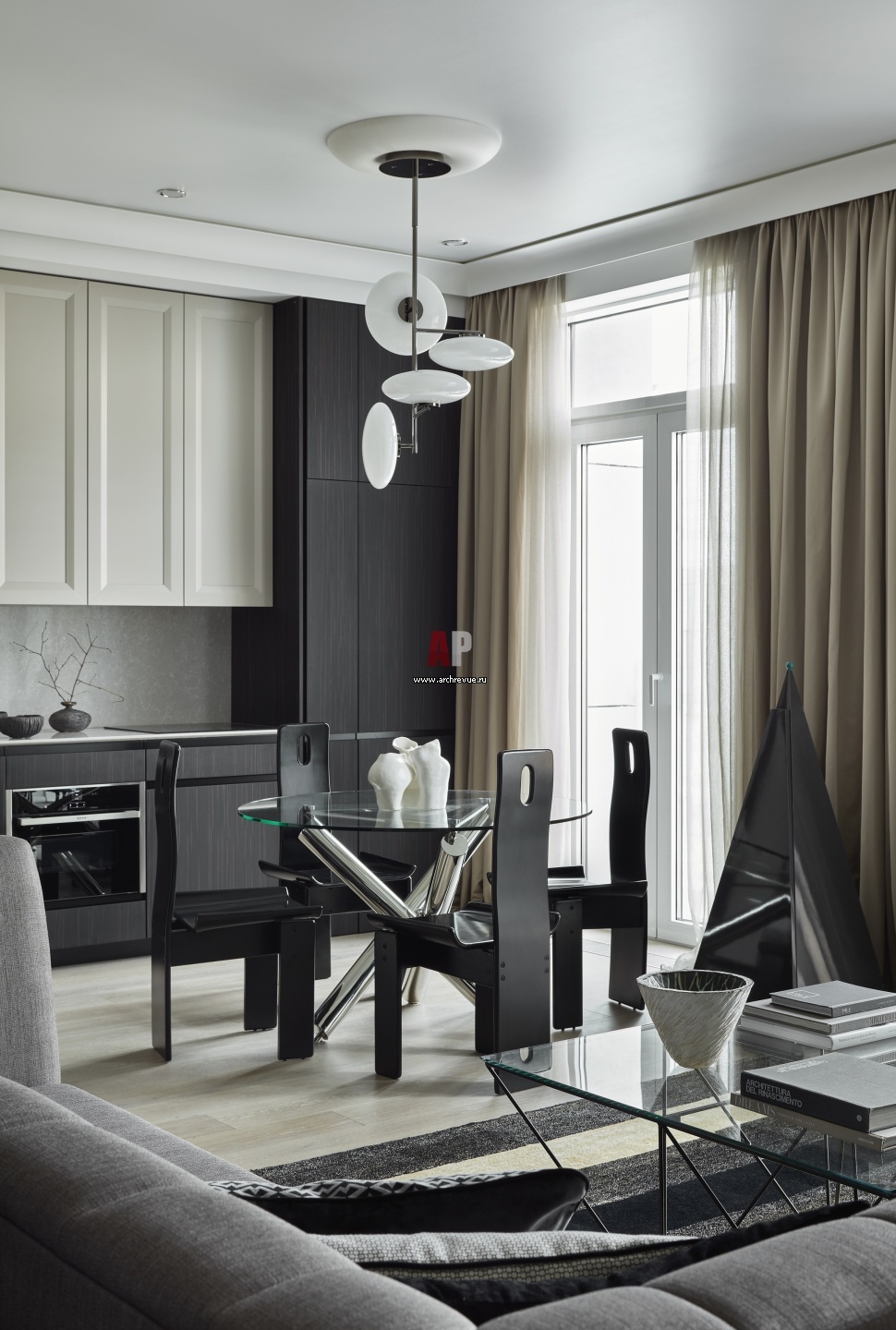Монохромная квартира в клубном доме. Интерьер столовой-кухни. Обеденный стол, Eichholtz. Стулья с высокими спинками, винтаж.