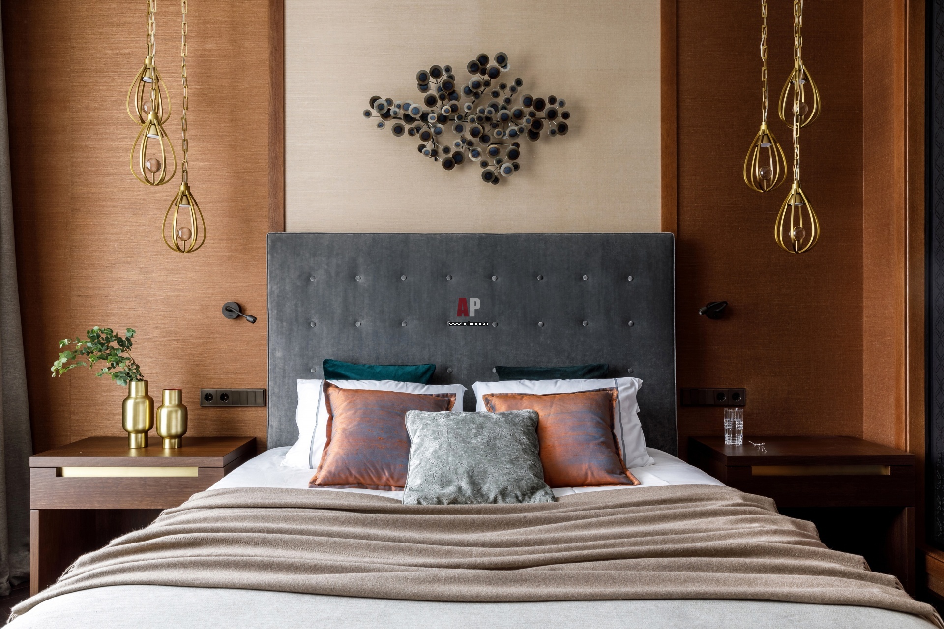 Хозяйская спальня оформлена в теплых терракотовых тонах. На стенах – обои из натуральных высушенных водорослей. Кровать с высоким текстильным изголовьем и матрас, Savoir Beds. Прикроватные тумбочки, Mobilfresno. Светильники, декоративное панно, Arteriors.