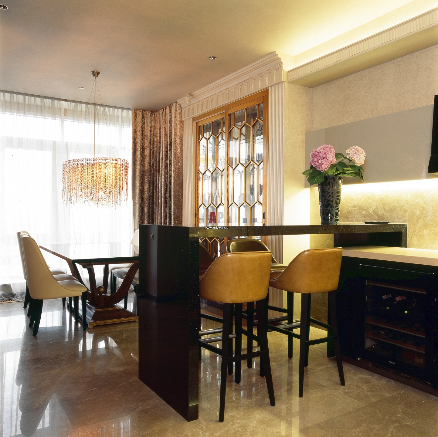Барная стойка из черного гранита отделяет кухню от столовой. Стол, Christopher Guy. Стулья, Baxter. Люстра, Lolli e Memmoli. Шторы из бархата, Andrew Martin.