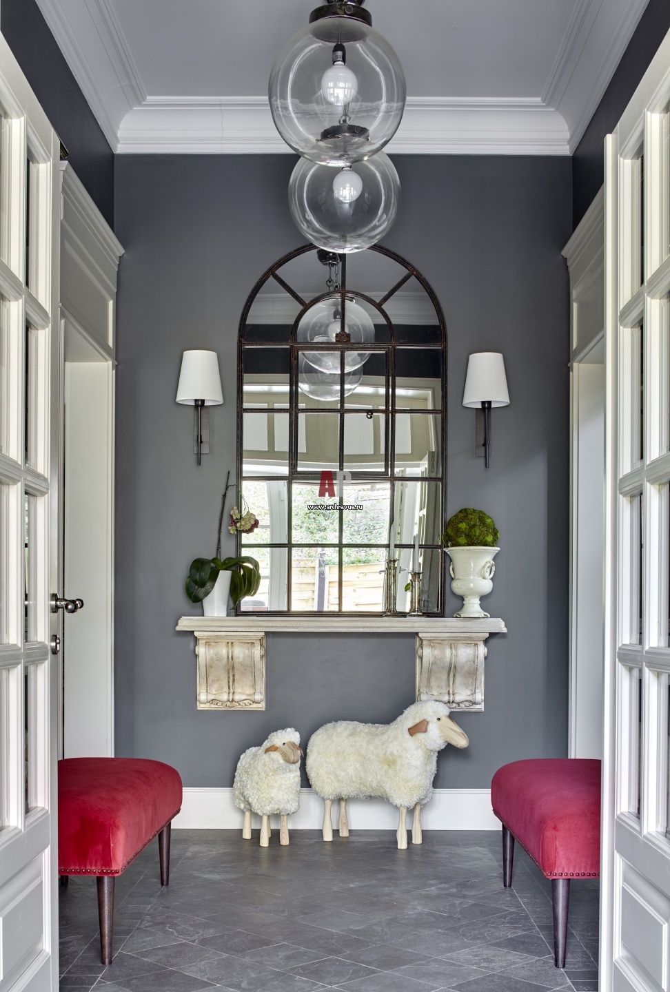 Прихожая, коридоры и проходные зоны решены на контрасте со светлыми жилыми помещениями. Стены в них выкрашены в темно-серый цвет. Зеркало и светильники, Flamant. Бра, Stephane Davidts.