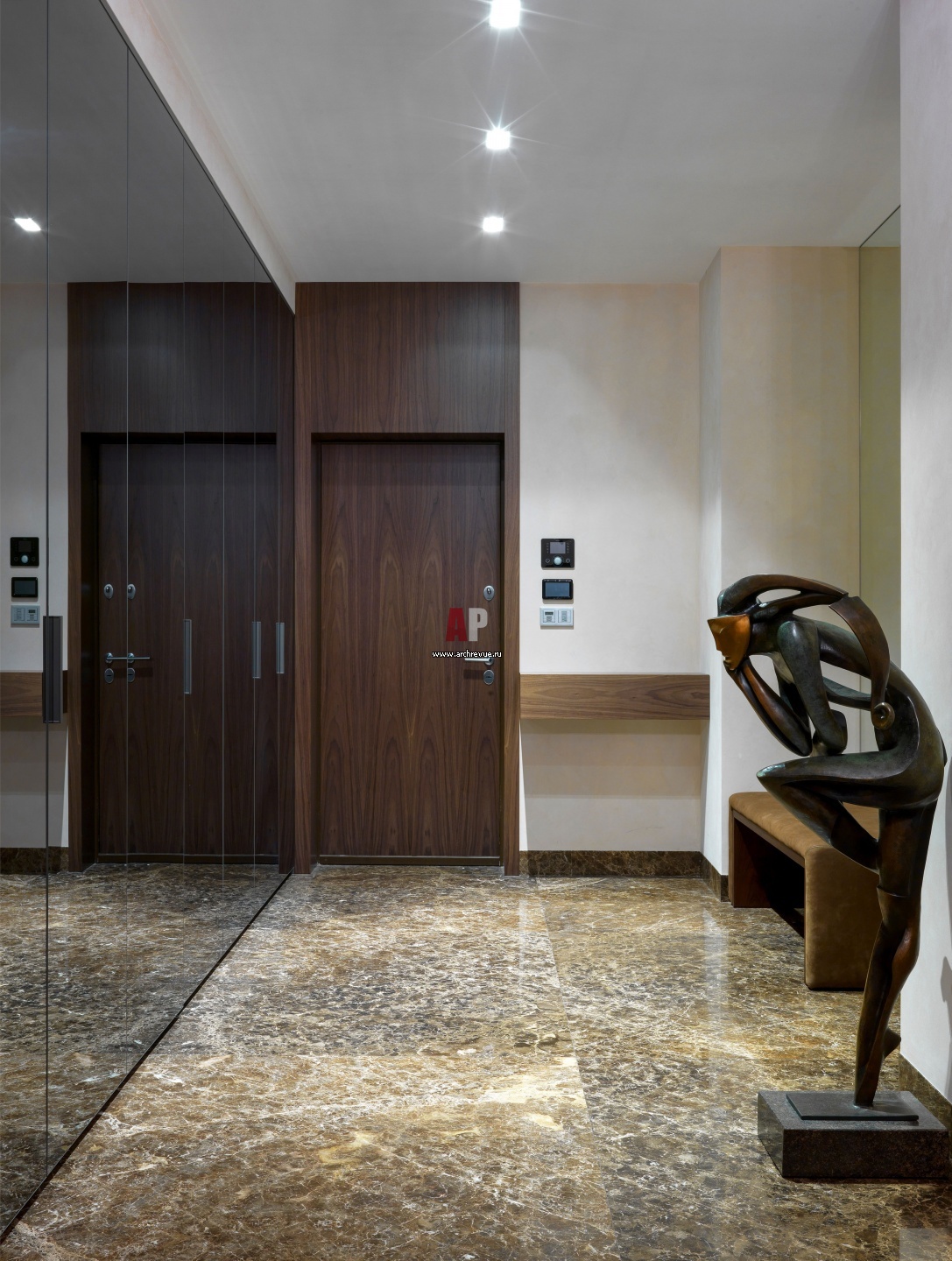Прихожая оформлена в парадном ключе: на полу – цельный камень, шкафы с дымчатым стеклом, входная дверь обрамлена высоким порталом из массива ореха. Шкафы, Poliform. Банкетка, Smania. Скульптура работы Арсена Аветисяна.