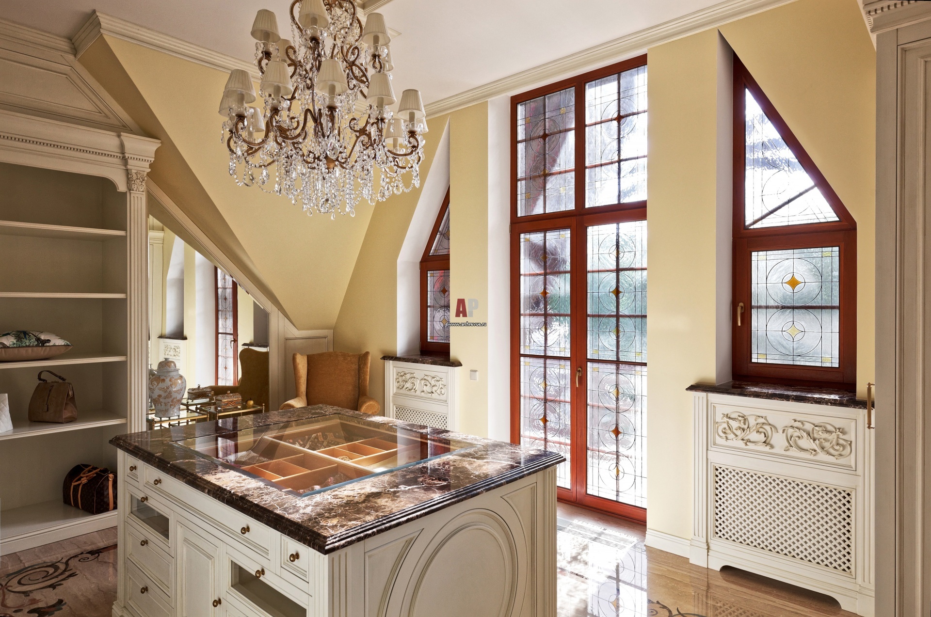 Женская гардеробная имеет выход на открытую террасу. Окно декорировано художественным витражом.