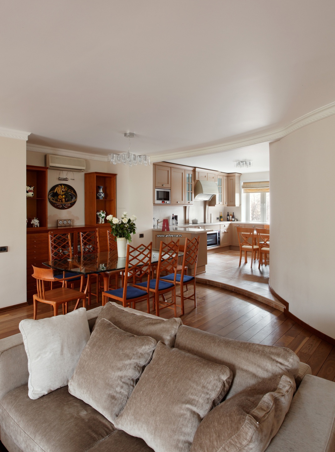 Зона кухни в гостиной выделена полукруглой стеной и небольшим подиумом. На полу мокрой зоны – клинкерная плитка Azulev, коллекция Cuenca. Мебель для кухни нежного сливочного цвета от Aster Cucine, поставщик «ТРИО-Интерьер».