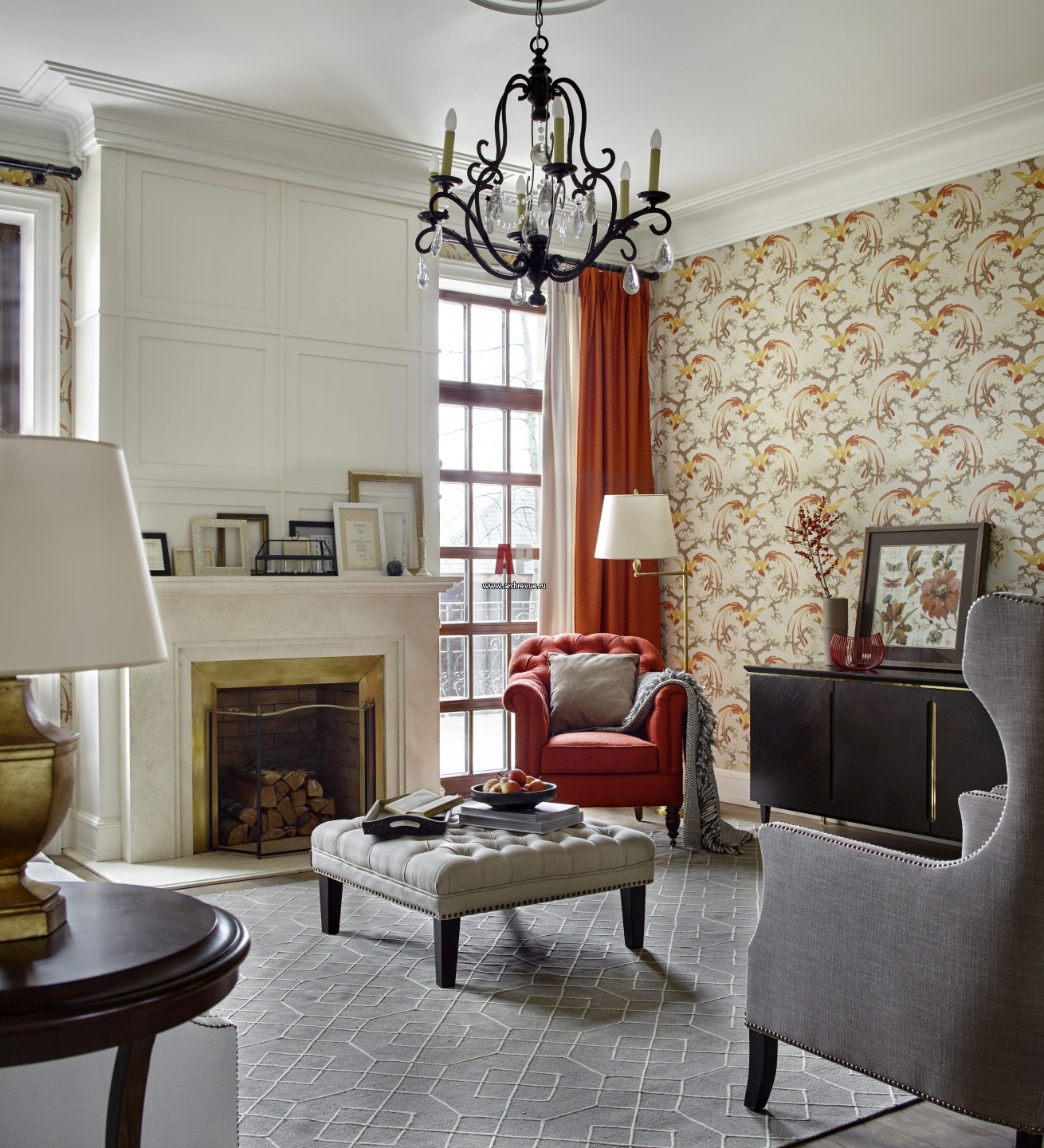 Зона гостиной с камином. Портал камина выполнен из камня со вставками из латуни. Люстра, настольные лампы, Visual Comfort & Co, E. F. Chapman и Thomas O'Brien. Обои, BorasTapeter. Серые кресла, диван Bernhardt. Пуф-столик, LeHome. Красное кресло, Caracole. Столик, Hooker.