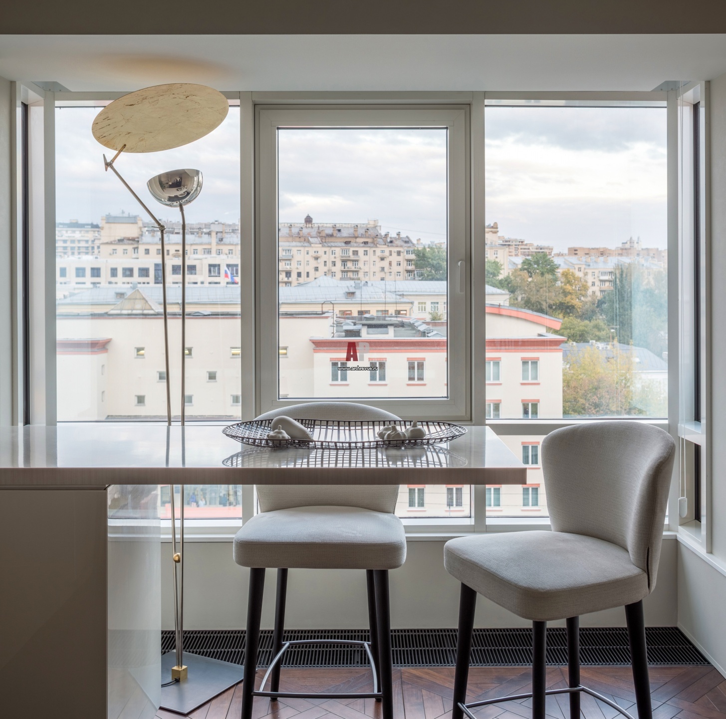Рядом с панорамным окном к кухне примыкает барная стойка. Столешница выполнена из светлого мрамора.