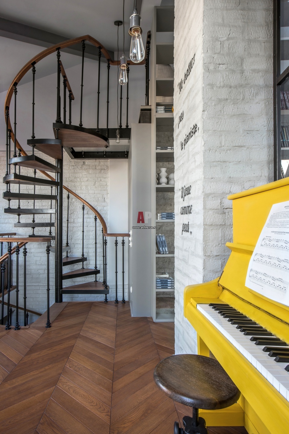 Трехэтажная квартира с мансардой и надстроенной антресолью. Все уровни соединяет винтовая лестница с ограждением из ажурного металла.