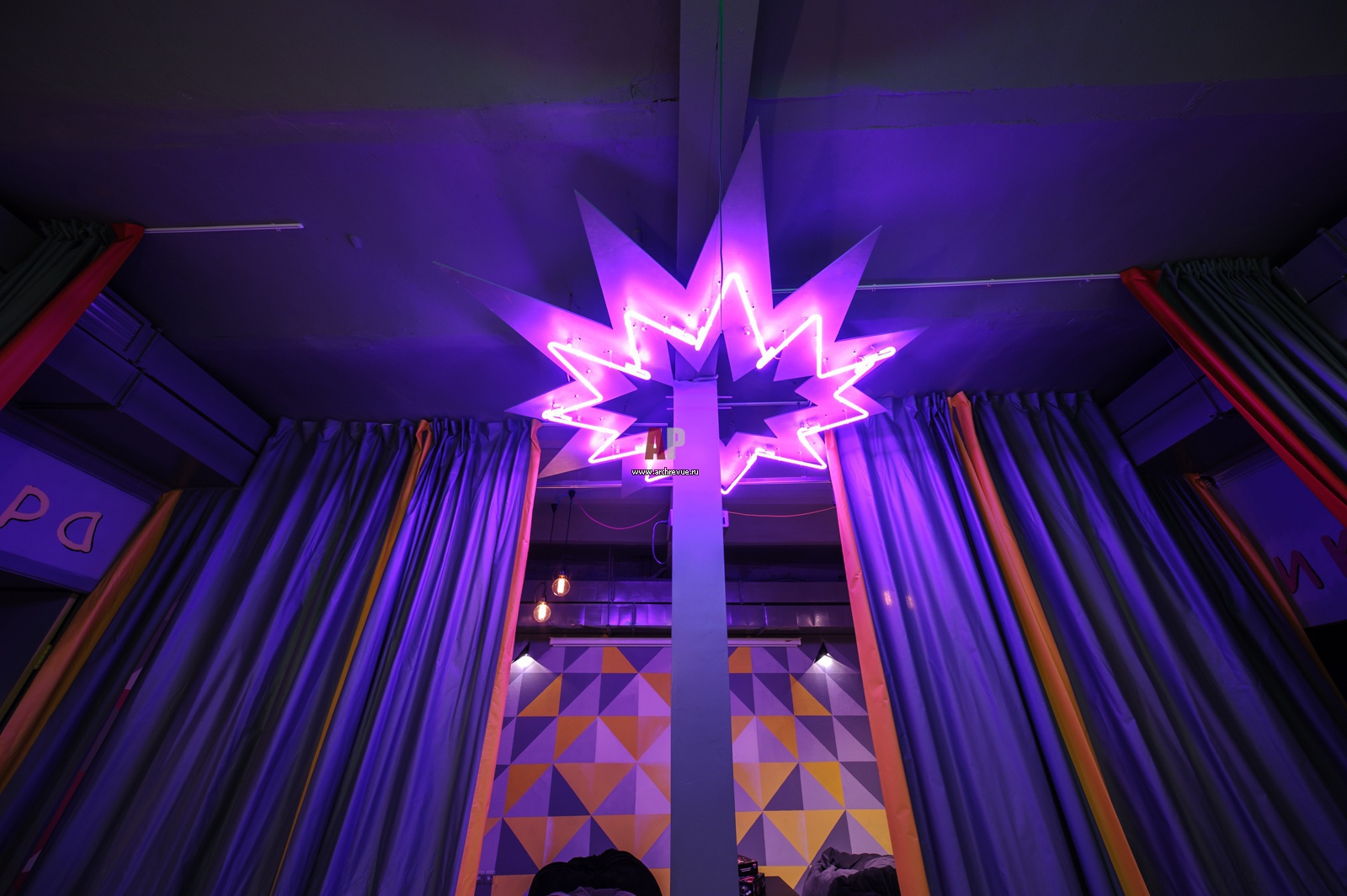 Конструктивные колонны основного зала оформлены коронами из неона.