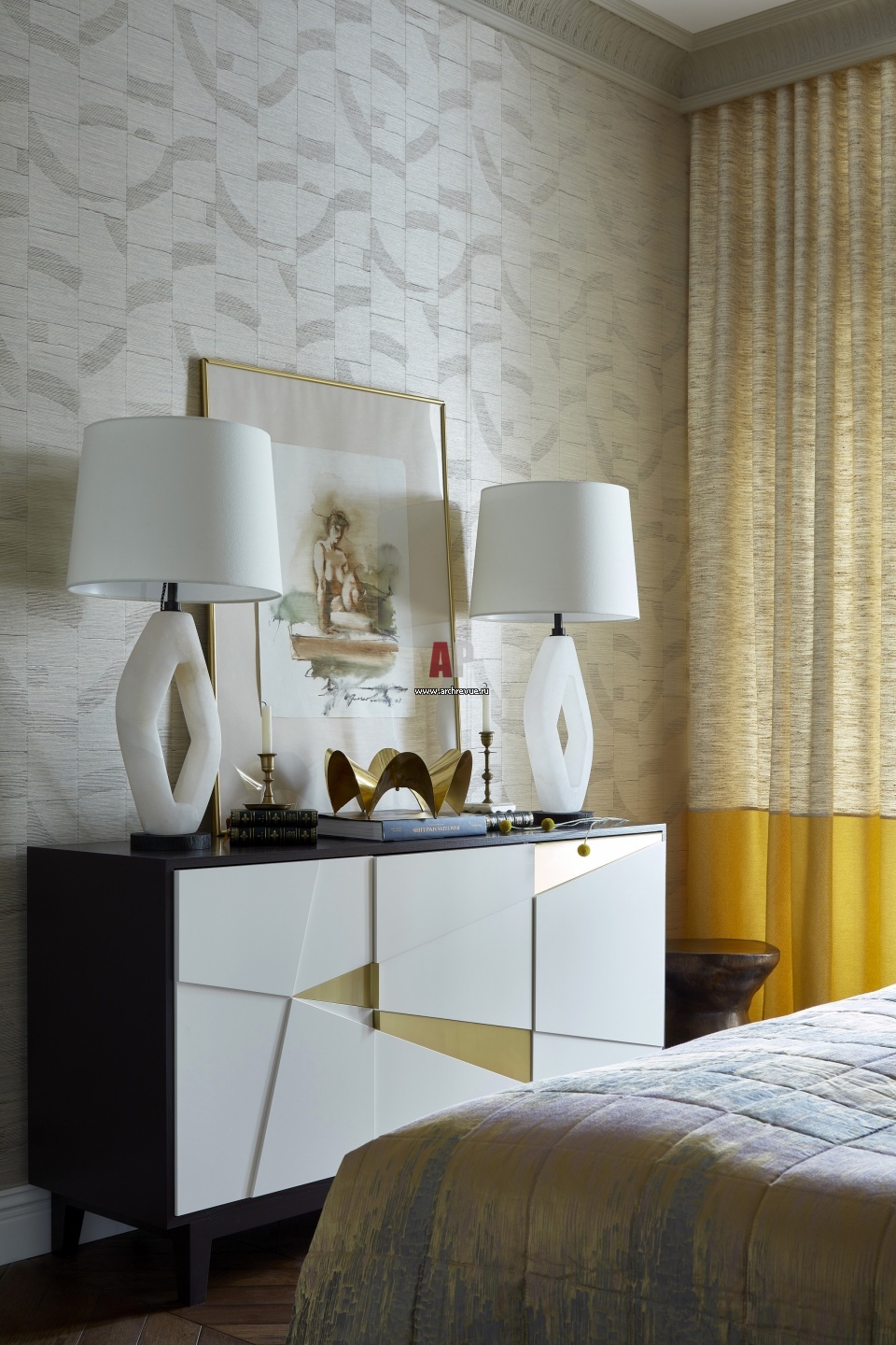 Эклектичная квартира с современным искусством. Интерьер спальни. Комод с модульным фасадом сделан на заказ. Лампа, Visual Comfort & Co. Картина на комоде – Эдуард Гороховский.