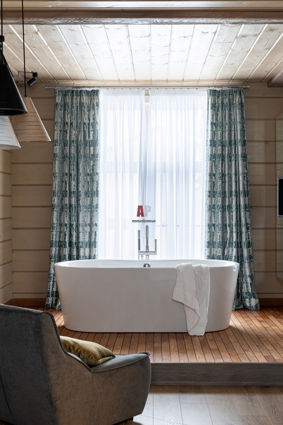 Спальня с ванной. На подиуме – отдельностоящая ванна, Kolpa-san, модель Сomodo. На полу мокрой зоны –тиковая доска.