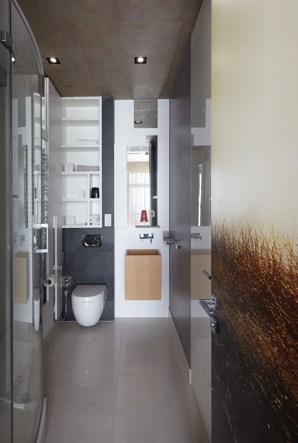 Интерьер санузла выполнен в стиле минимализм. Глянцевые поверхности в интерьере рифмуются с матовыми отделками.