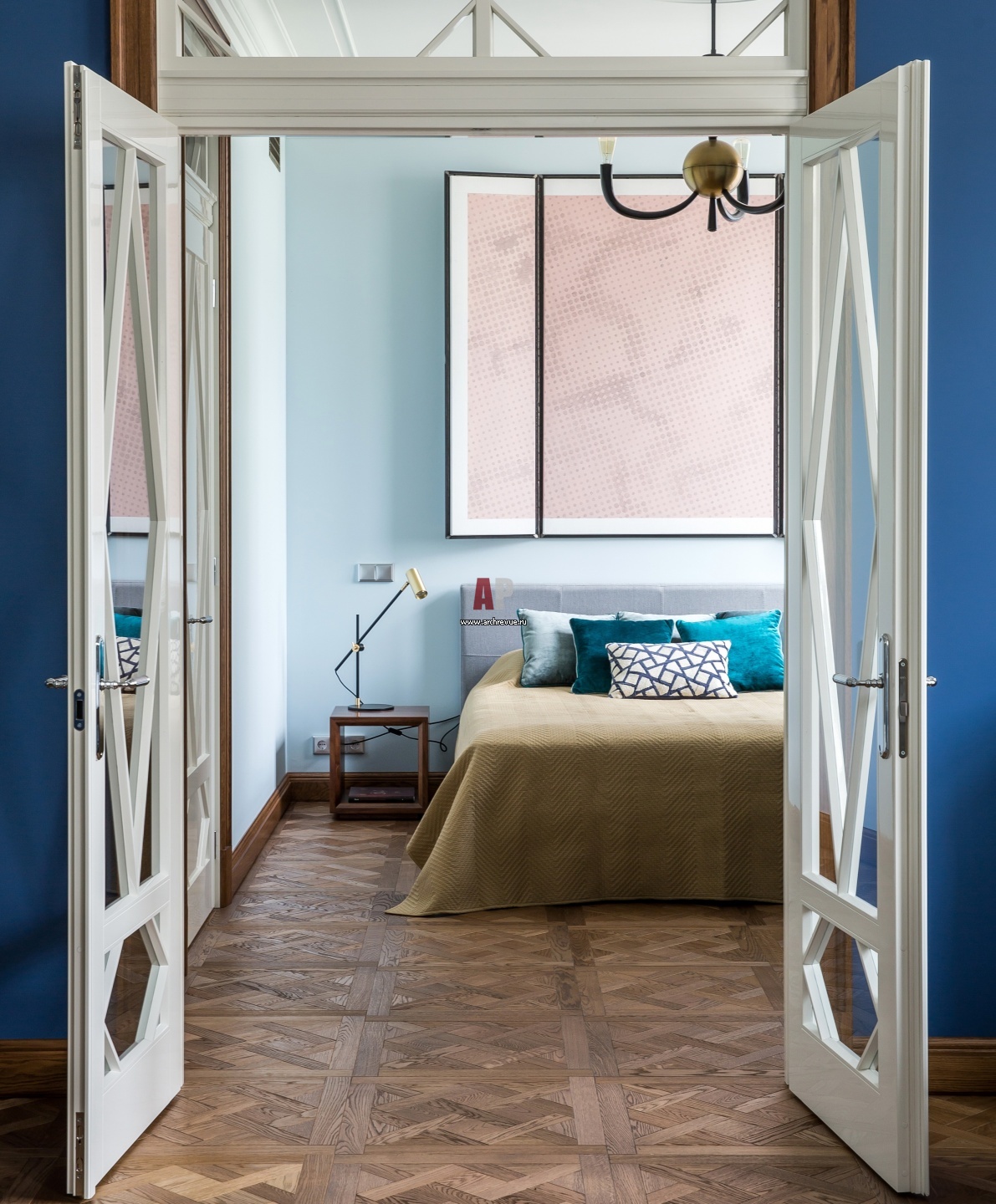 Интерьер спальни, смежной с гостиной. От общей зоны приватную часть отделяют межкомнатные двери с расстекловкой и стеклянной фрамугой до потолка. Обрамление из дерева переходит в плинтус и наличники, что создает оригинальный рисунок стен.