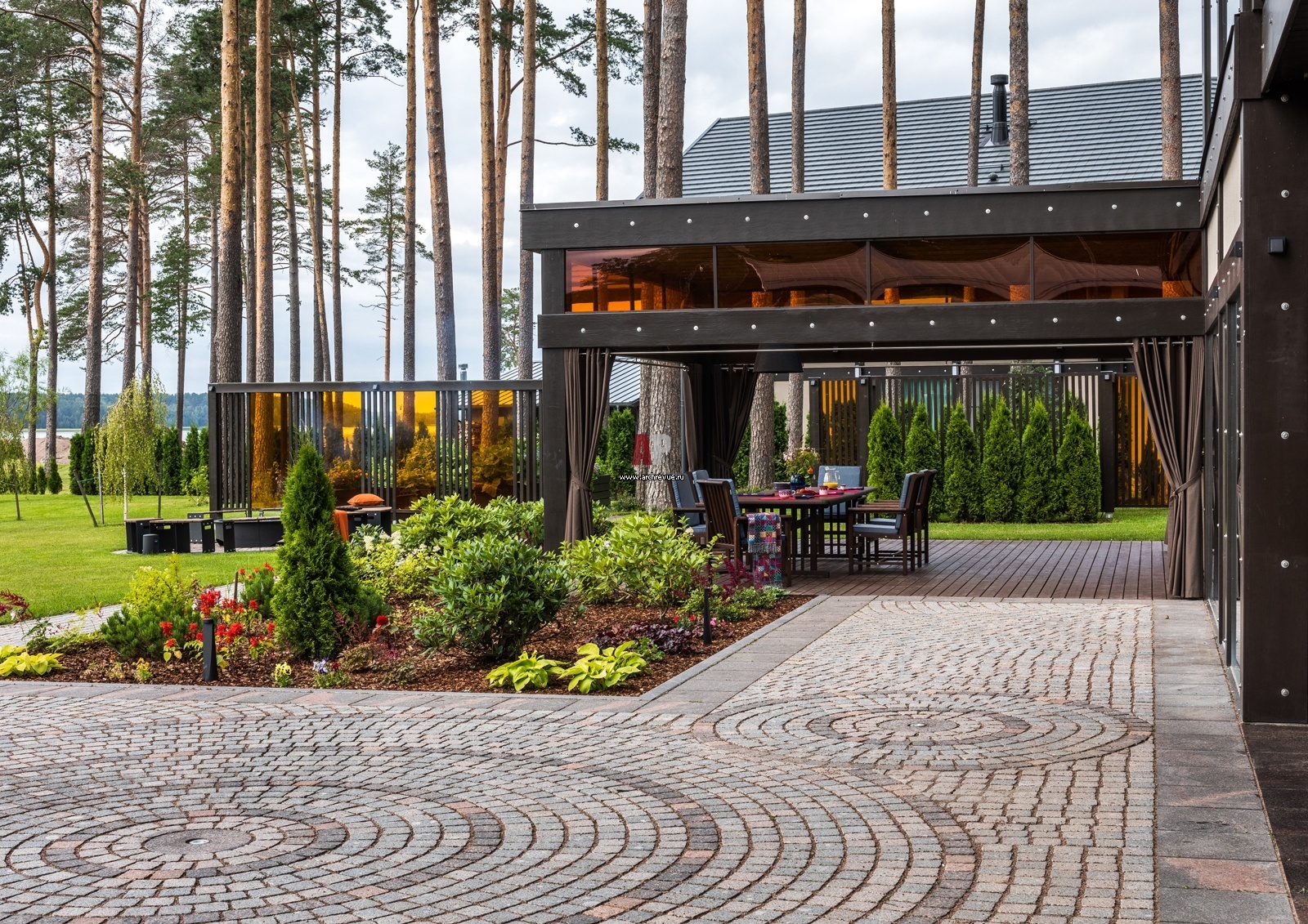 Перед домом сделано патио с террасой под навесом и летней кухней.