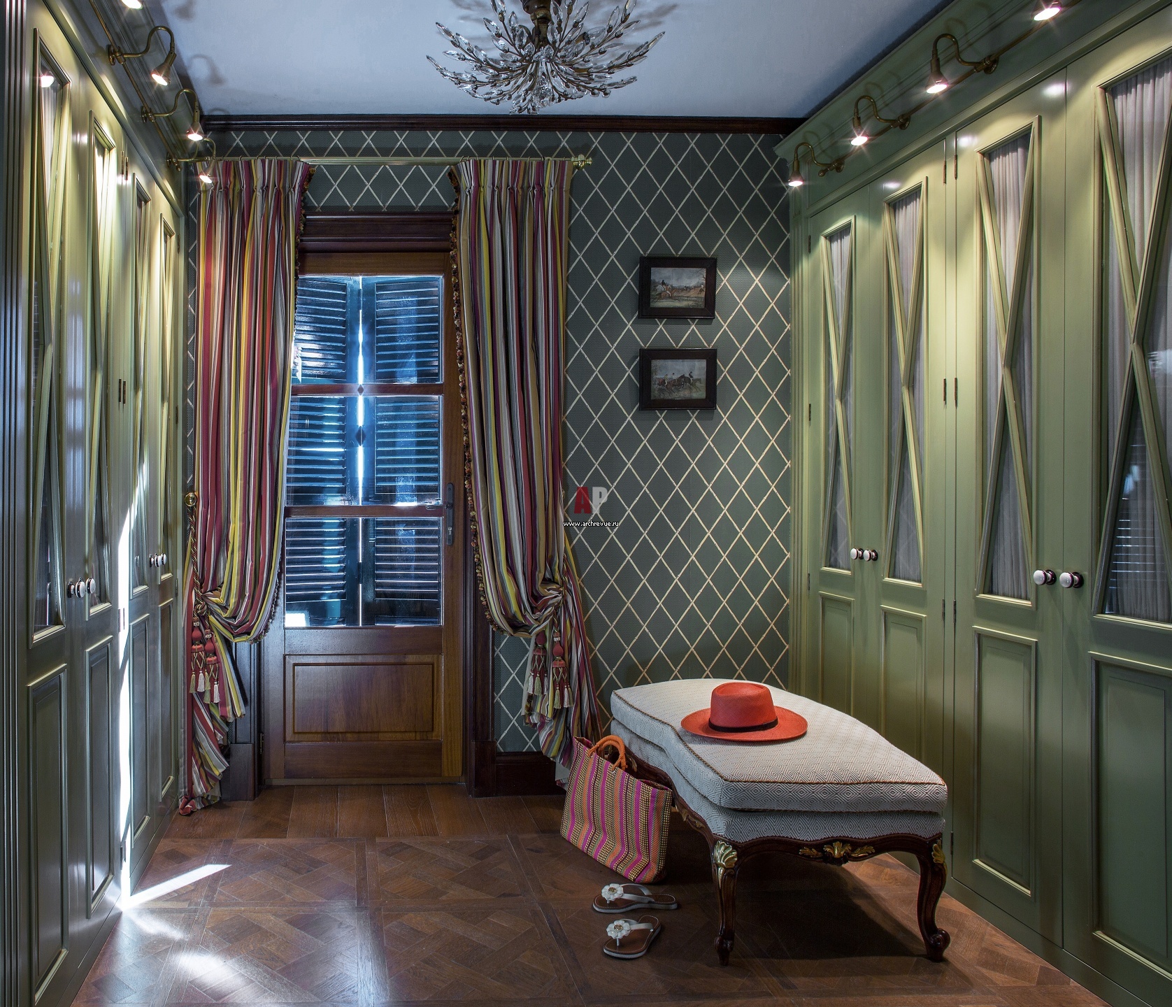 Интерьер гардеробной комнаты выполнен в неоклассическом стиле. На полу – модульный паркет из древесины ореха.
