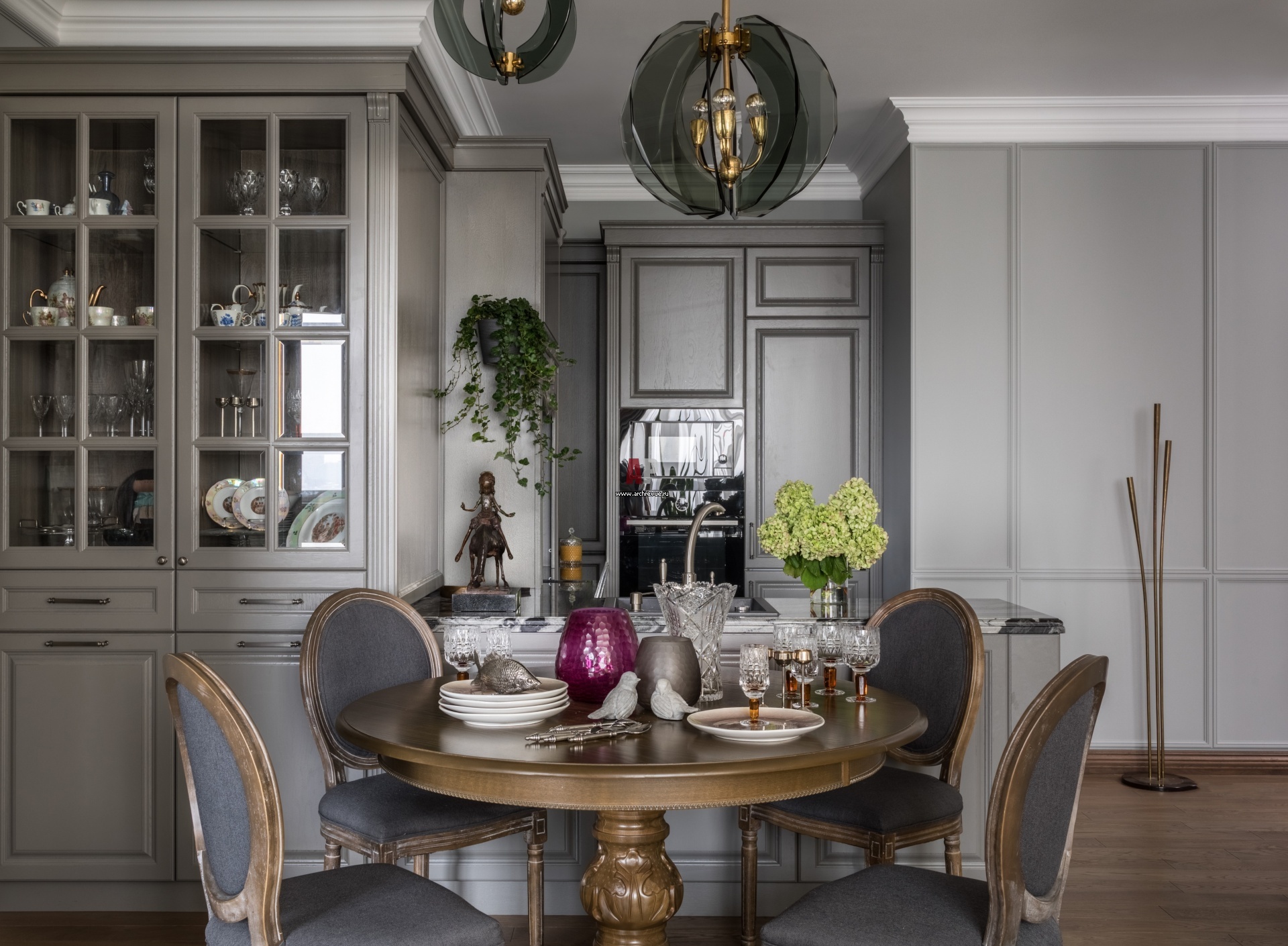 Интерьер квартиры в сложных серых тонах. Большая часть мебели выполнена на заказ по эскизам дизайнера, выкрасы подбирались в индивидуальном порядке. На полу – массив дуба теплого цвета.