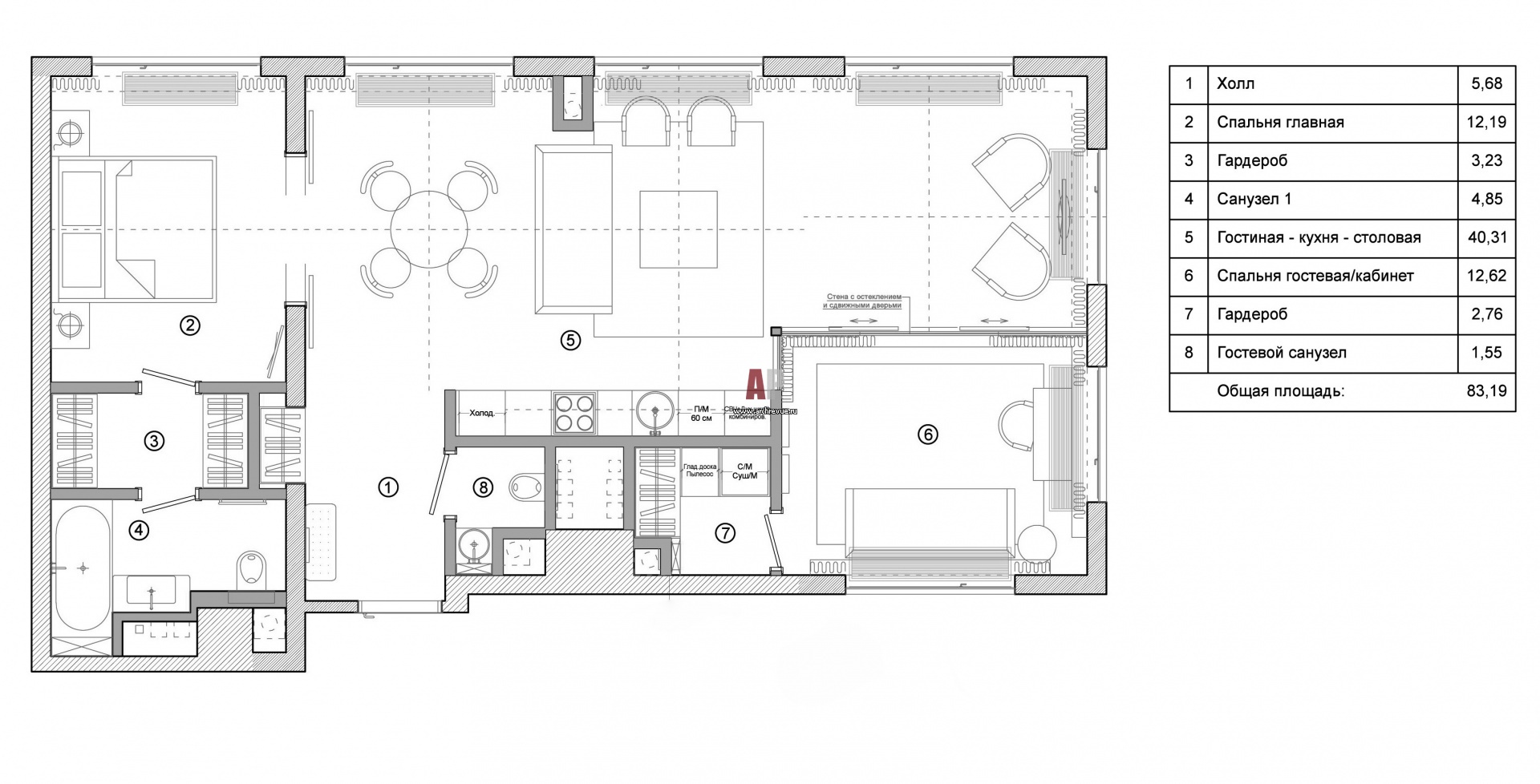 План с расстановкой мебели квартиры в ЖК «Пресня Сити». Общая площадь – 83 кв. м.
