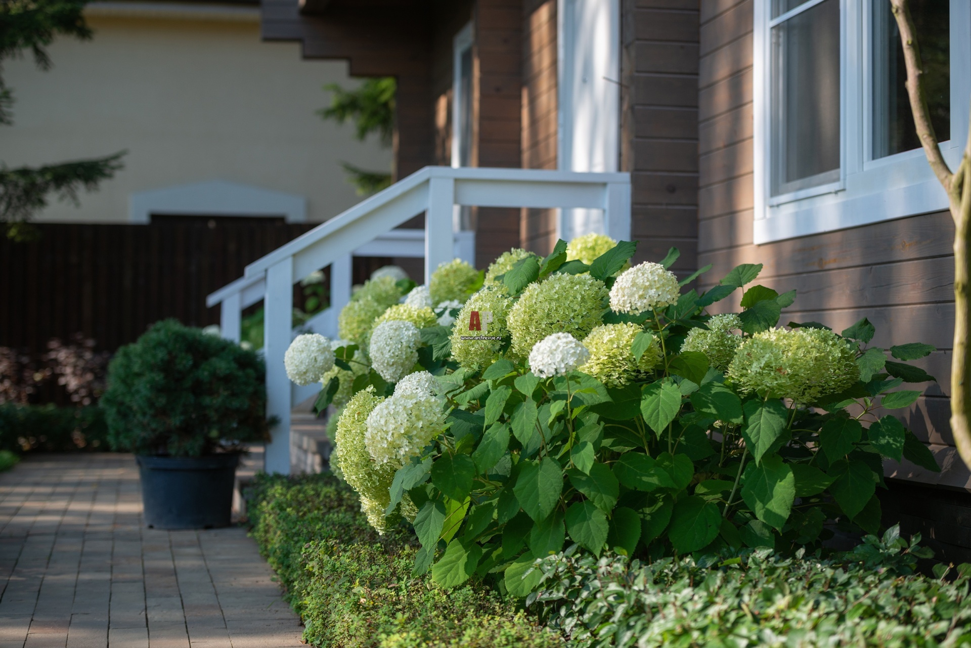 Камерный природный сад в Подмосковье. Дом по периметру оформлен зелеными массивами гортензий.